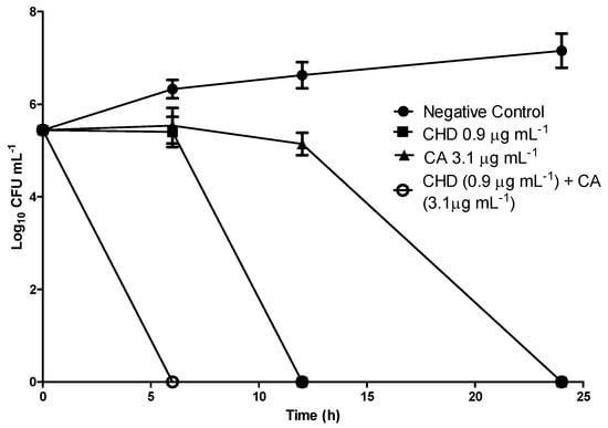 The interesting results obtained for CA against the main pathogen related to periodontitis motivated us to conduct time-kill curve assays against P. gingivalis (5 × 105 CFU mL−1) using this compound at 3.1, 6.2, and 12.4 µg mL−1 (respectively one, two, and three times its MBC). CHD was used as positive control at its MBC value (0.9 µg mL−1). The constructed curves are depicted in Figure 2.