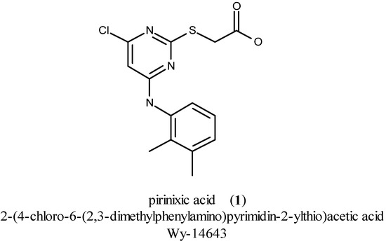 Pirinixic acid [1, Wy-14643, 2-(4-chloro-6-(2,3-dimethylphenylamino)pyrimidin-2-ylthio)acetic acid; Figure 1] was discovered in the 1970s, during the development of new agents against hypercholesterolemia [1]. Later on, in 1977, it was identified to be a peroxisome proliferator [2]. After the discovery of the peroxisome proliferator-activated receptor (PPAR) in 1990 [3], the agonistic activity of pirinixic acid at PPARα and PPARγ was detected within the next ten years [4,5].