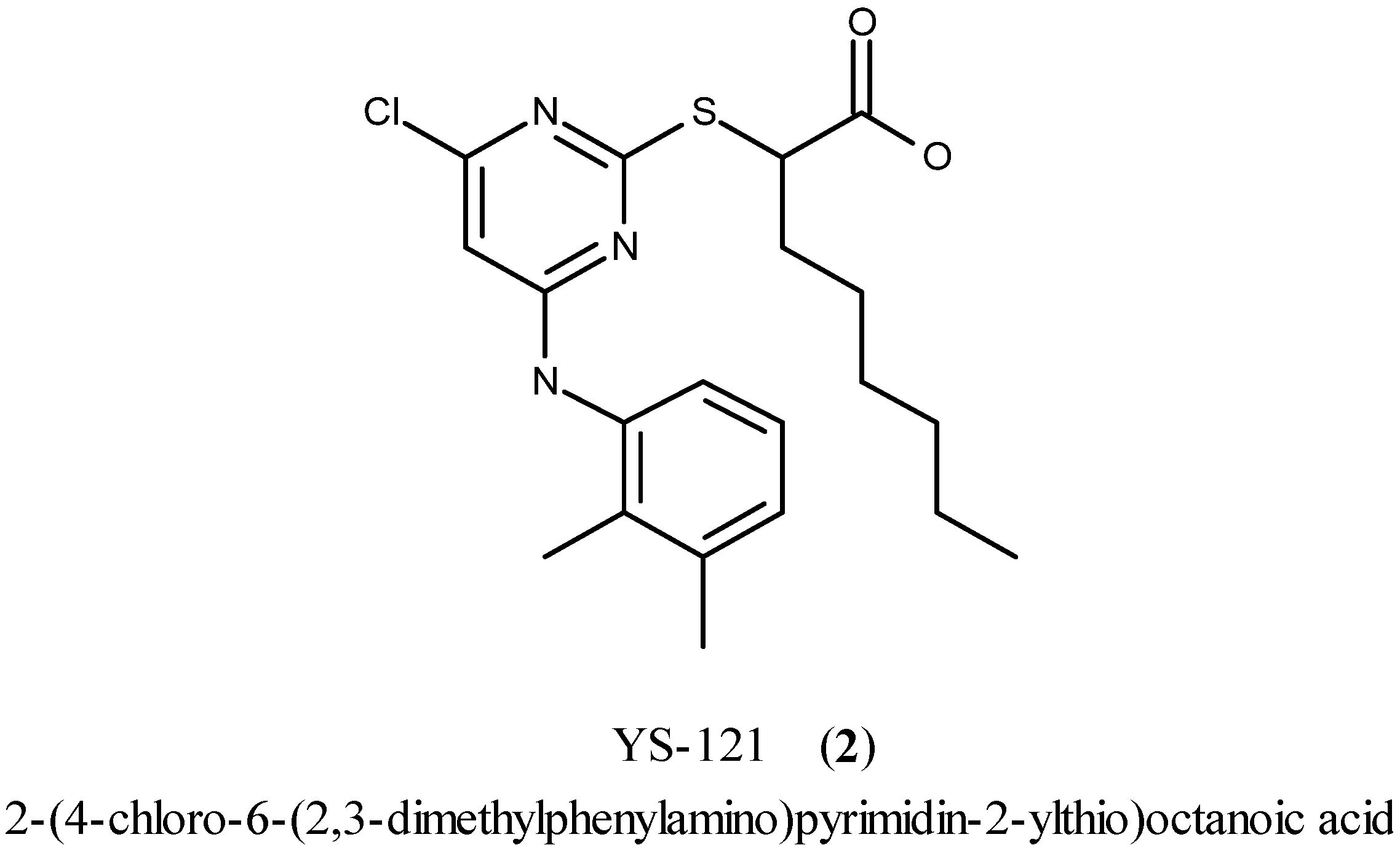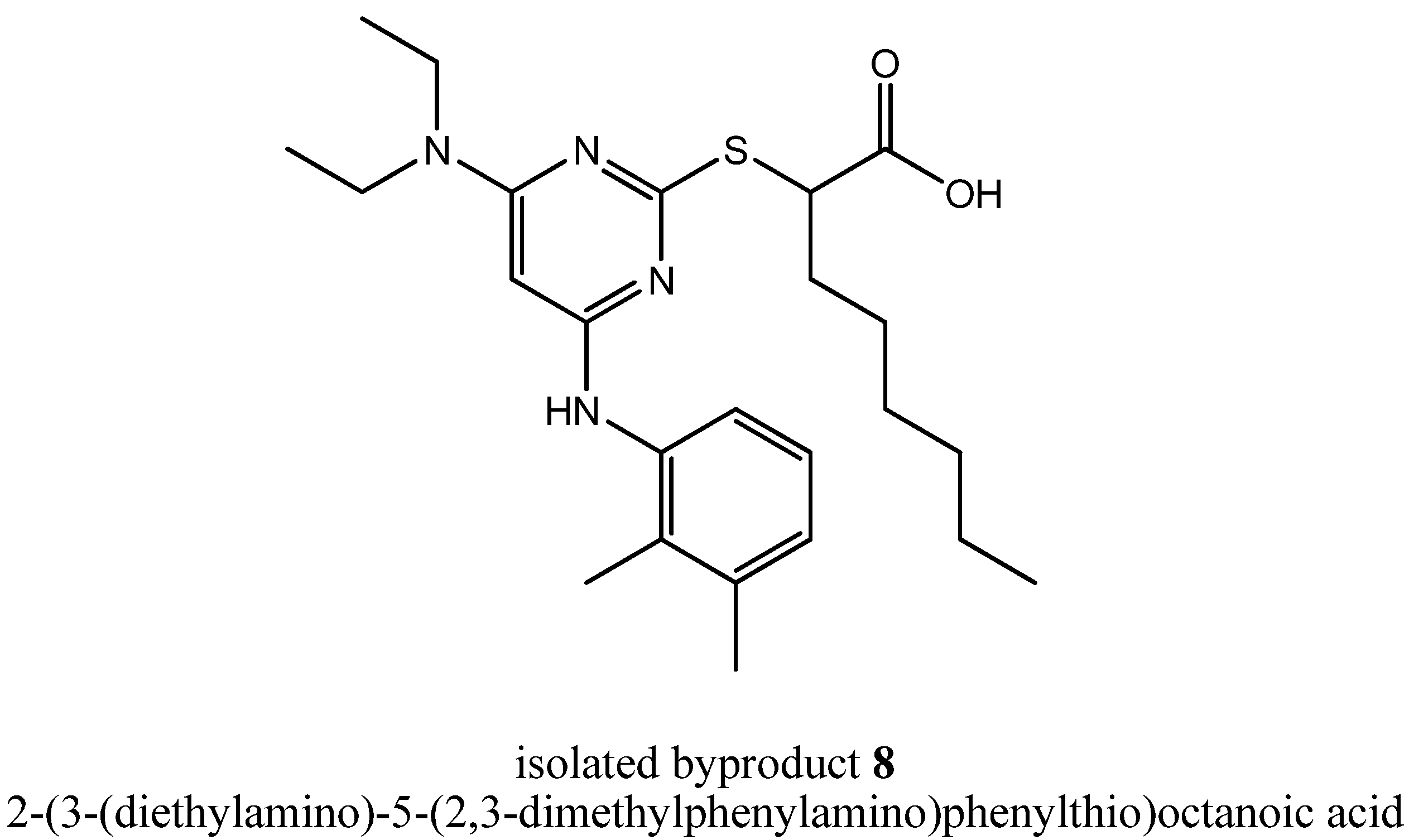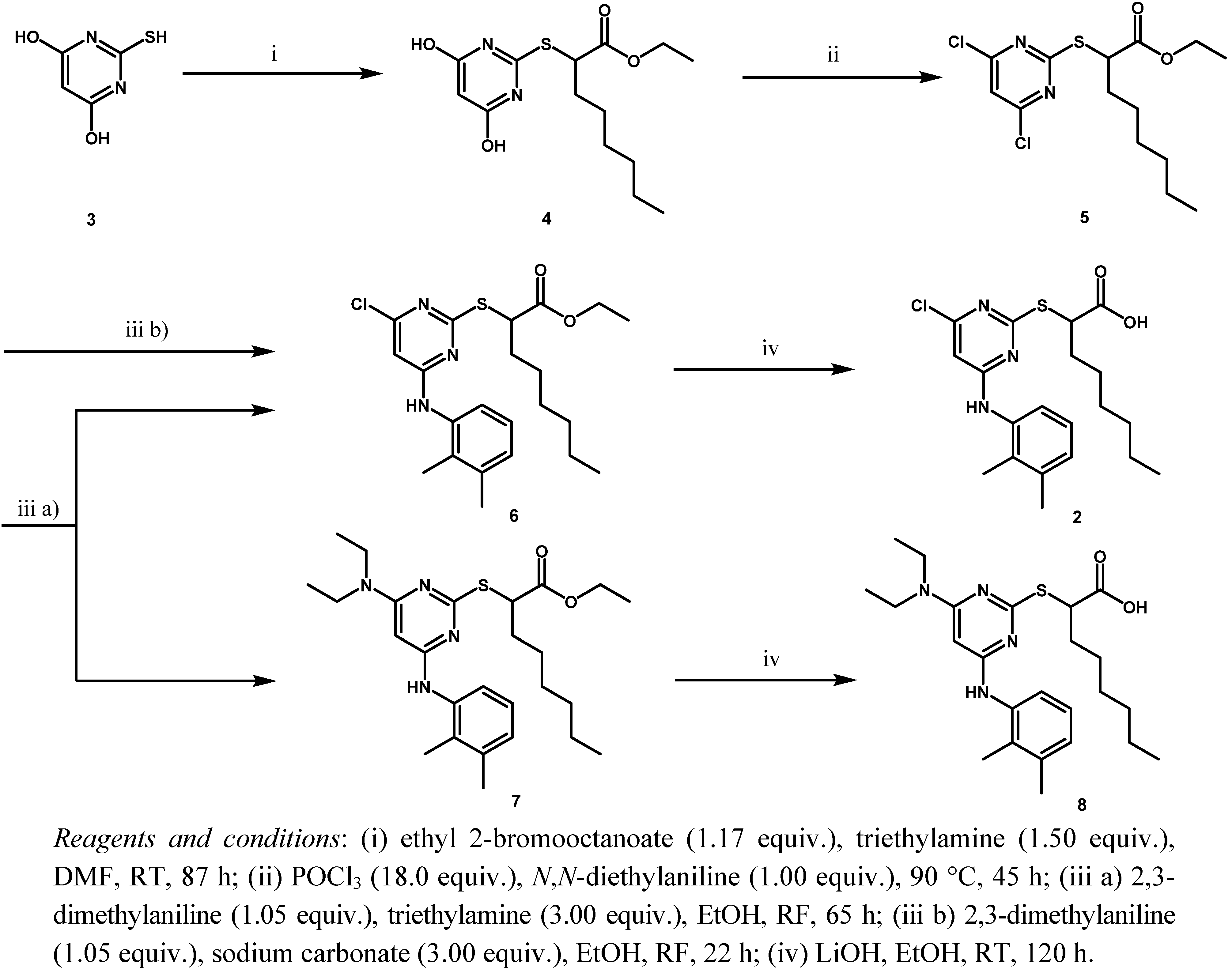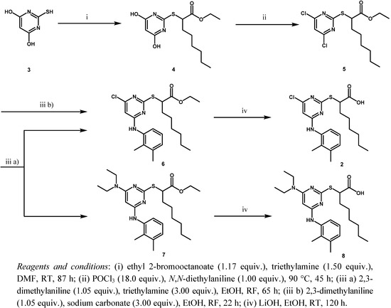 During the first step, 2-mercaptopyrimidine-4,6-diol (3) reacted by a nucleophilic substitution with ethyl 2-bromooctanoate in DMF in the presence of triethylamine to form the thioether derivative ethyl 2-(4,6-dihydroxypyrimidin-2-ylthio)octanoate (4). Chlorination with POCl3 and N,N-diethylaniline gave the chlorinated pyrimidine derivative ethyl 2-(4,6-dichloropyrimidin-2-ylthio)octanoate (5). Through a nucleophilic aromatic substitution at the pyrimidine core of 5, one chloro group was substituted by 2,3-dimethylaniline with triethylamine in EtOH to form the monoaminated derivative ethyl 2-(4-chloro-6-(2,3-dimethylphenylamino)pyrimidin-2-ylthio)octanoate (6, iii a). Additionally, the disubstituted byproduct ethyl 2-(4-(diethylamino)-6-(2,3-dimethylphenylamino)pyrimidin-2-ylthio)-octanoate (7) was formed during that step. Changing the assisting base to sodium carbonate in step (iii b), lead to a circumvention of that byproduct formation. The last step to get to the desired compound YS-121 (2) consisted of a saponification of the ethyl ester derivative 6 with LiOH in EtOH to give the carboxylic acid derivative 2-(4-chloro-6-(2,3-dimethylphenylamino)-pyrimidin-2-ylthio)octanoic acid (2). Because 6 and 7 could not be separated during the purification procedure of step (iii a), 7 was also hydrolyzed during step (iv) to give the byproduct (2-(3-(diethylamino)-5-(2,3-dimethylphenylamino)-phenylthio)octanoic acid (8), which could be separated from 2 and its structure elucidated afterwards.