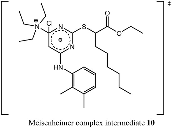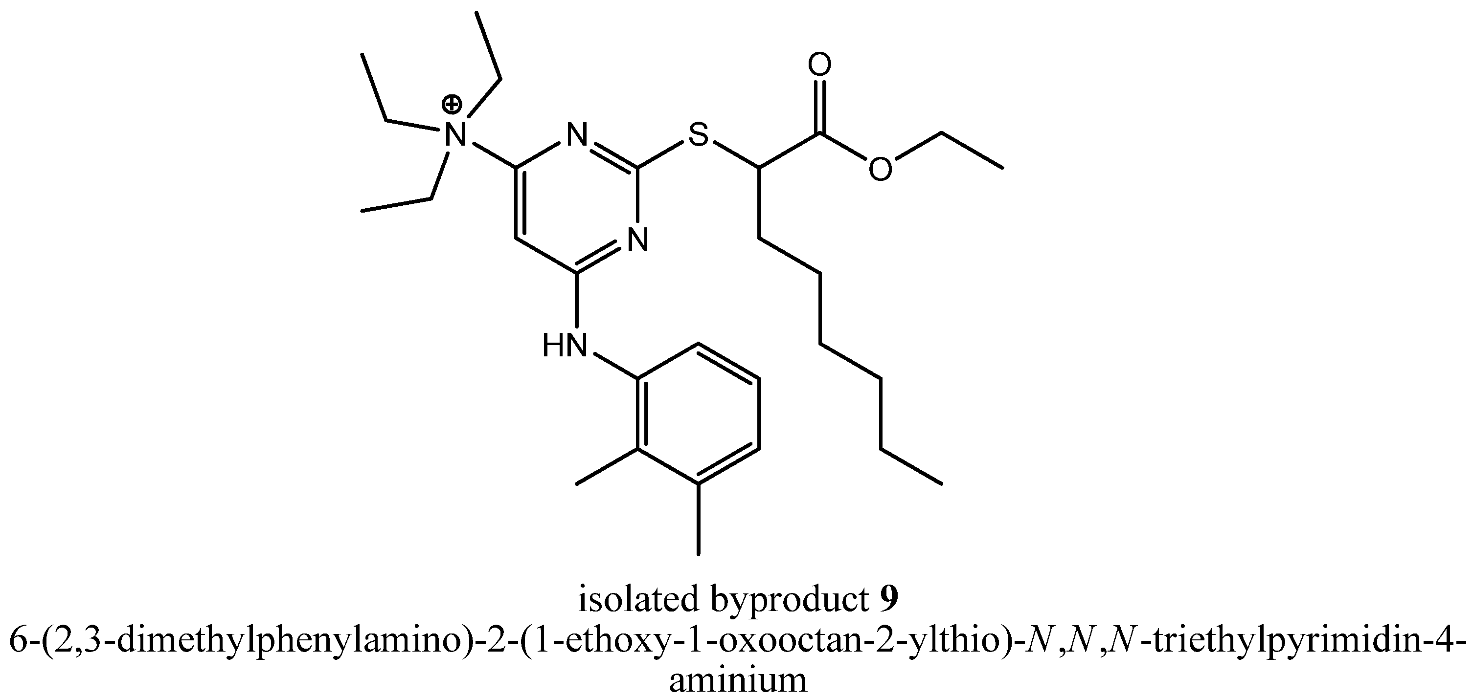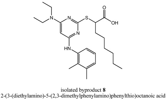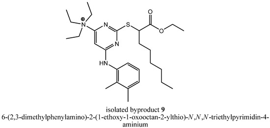To get deeper insights into the mechanism leading to the formation of byproduct 8, we repeated step (iii a) with triethylamine as assisting base and could reproduce that byproduct formation in two reaction batches reacted independently from each other. Afterwards, we tried to isolate other byproducts of that reaction that could tell us something about the mechanism leading to 8. In fact, we were successful, because we could isolate the stable intermediate 6-(2,3-dimethylphenylamino)-2-(1-ethoxy-1-oxooctan-2-ylthio)-N,N,N-triethylpyrimidin-4-aminium (9, Figure 4), the precursor of compound 7.