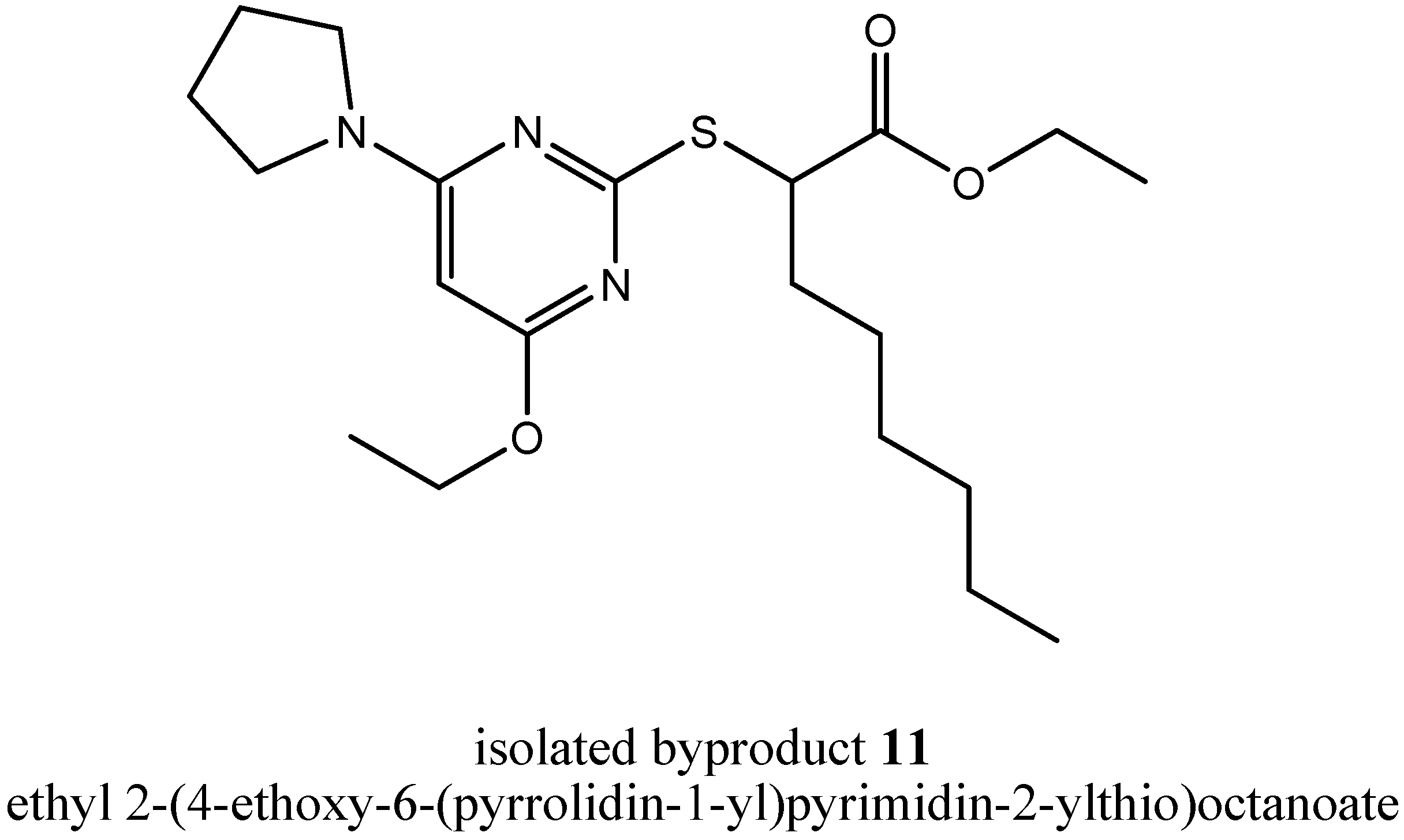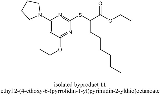 Additionally, other byproducts were formed in step (iii a), but we were not able to separate them satisfactorily. Because the insights into the mechanism of byproduct formation were still not sufficient, we repeated step (iii a) again, now with N-methylpyrrolidine as assisting base as a member of cyclic tertiary alkylamines. Again, we tried to isolate byproducts giving us new insights into the mechanism of byproduct formation and again, we were successful. We could isolate two byproducts telling us a lot about the mechanism. First, we could isolate the byproduct ethyl 2-(4-ethoxy-6-(pyrrolidin-1-yl)pyrimidin-2-ylthio)octanoate (11, Figure 6).