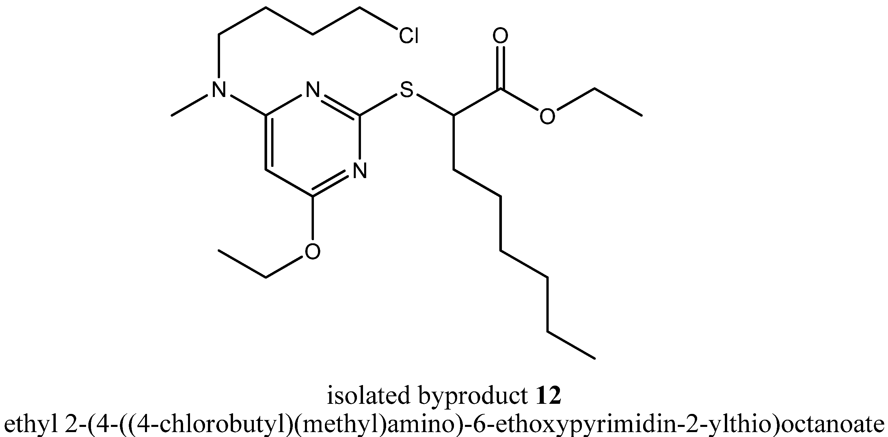 A deeper insight into the incidents taking place at the pyrrolidinyl residue was provided by the isolated byproduct ethyl 2-(4-((4-chlorobutyl)(methyl)amino)-6-ethoxypyrimidin-2-ylthio)octanoate (12, Figure 7).