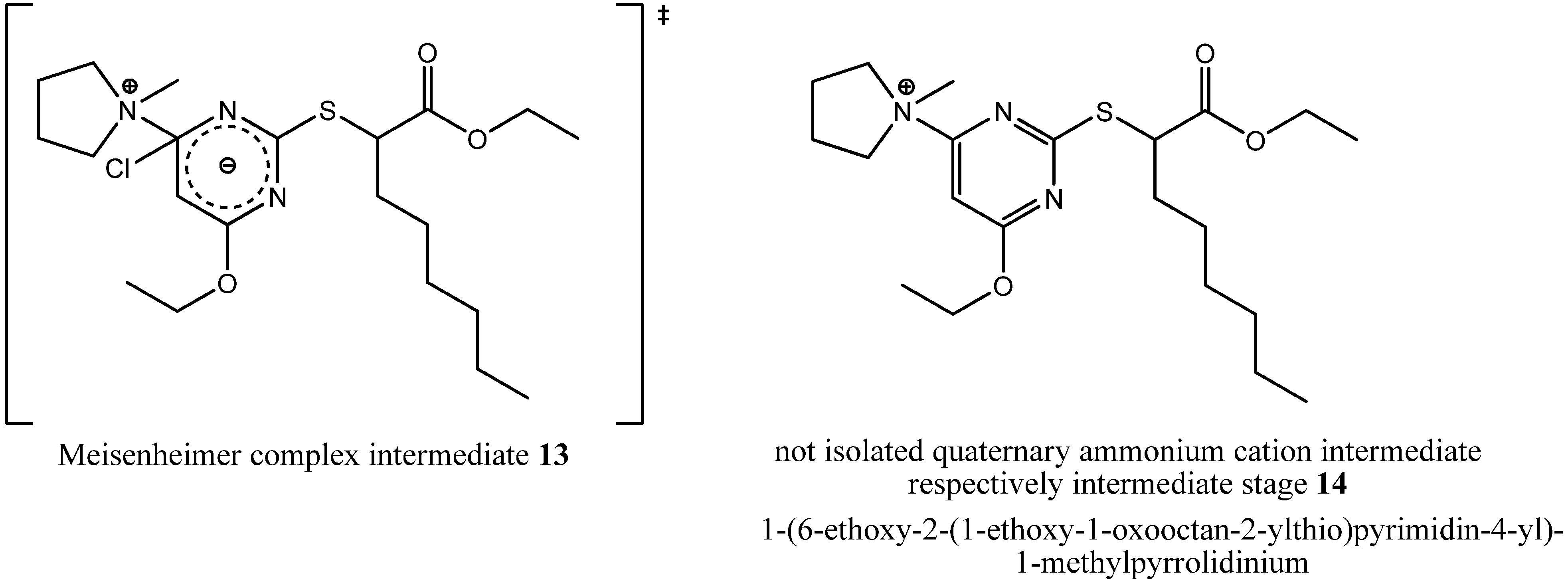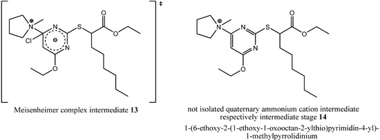 During formation of byproduct 12 the pyrrolidine ring was opened but no carbon residue was eliminated. In summary, only one equivalent of hydrochloric acid was eliminated through a solvolytic reaction with ethanol, but the terminally chlorinated n-butyl residue as well as the methyl residue of the N,N-dialkylaminyl substituent at the pyrimidine core provided evidence for the ring opening mechanism. That ring opening probably had happened either through a nucleophilic attack of a chloride ion during the state of a Meisenheimer complex intermediate 13 as a concerted process together with the elimination of the chloride ion from the pyrimidine core or during the state of a quaternary ammonium cation such as 1-(6-ethoxy-2-(1-ethoxy-1-oxooctan-2-ylthio)pyrimidin-4-yl)-1-methylpyrrolidinium (14, Figure 8) as a non-concerted process.