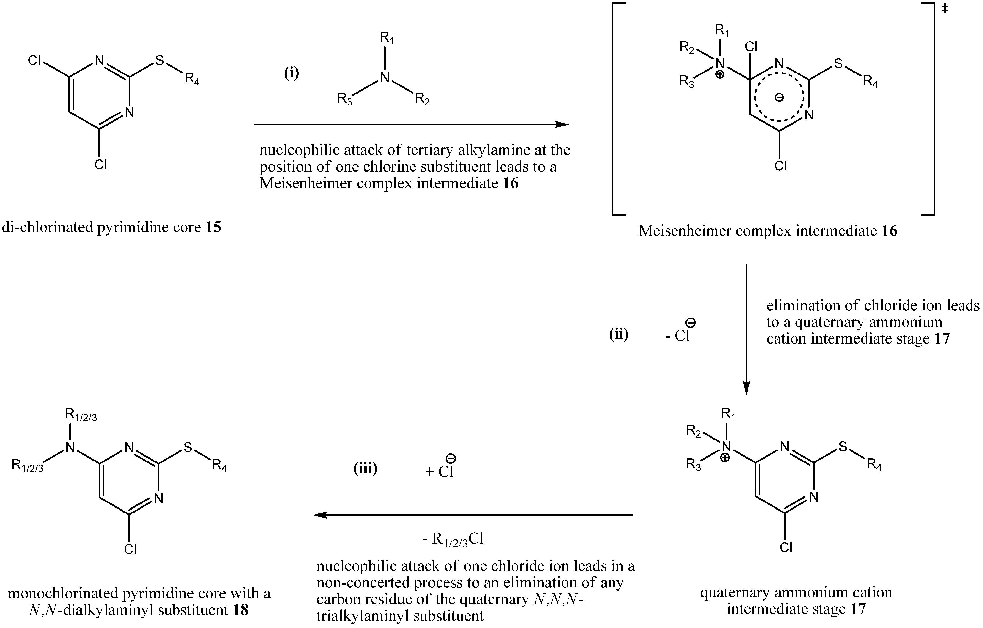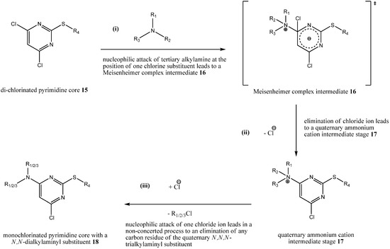 (i) A nucleophilic attack of a tertiary alkylamine at a 4,6-di-chlorinated pyrimidine core 15 leads to a Meisenheimer complex intermediate 16; (ii) afterwards, a chloride ion is eliminated leading through rearomatization to a quaternary ammonium cation intermediate stage 17; (iii) finally, a nucleophilic attack by a chloride ion at any carbon residues of the quaternary N,N,N-trialkylaminyl substituent of 17 leads to a monochlorinated pyrimidine core with a N,N-dialkylaminyl substituent 18.