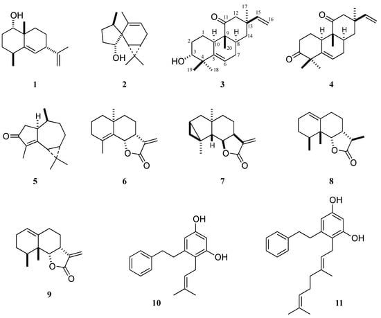 Due to their small morphology, liverworts (Hepaticae) are difficult to classify and identify. However, they are a rich source of terpenoids and aromatic compounds, which can be used to evaluate their chemosystematics [1,2]. In our search for new biologically active substances, we continue to study the chemical constituents of liverworts. Many liverworts are endemic to the southern hemisphere, including Oceania and South America. Recently, we have reported the structures of new sesqui- and diterpenoids from New Zealand liverworts [3]. We also reported the isolation of new sesquiterpenoids 1 and 2 from an unidentified Gackstroemia species from New Zealand [4]. During the course of our investigation of the chemical constituents of three Argentine Jungermanniales species (unidentified Anastrophyllum species, Radula voluta and Frullania brasiliensis), we isolated a new rosane diterpenoid 3 and six previously known compounds: Rosane 4, aromadendrane 5, two eudesmanes 6 and 7, two eremophilanes 8 and 9, and two bibenzyls 10 and 11 (Figure 1) and characterized their chemical structures. The chemosystematics of these three species from Argentina are discussed.