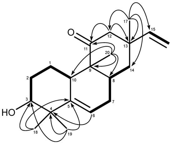 The 1H-1H COSY of 3 confirmed three partial segments: (A) -CH(OH)-CH2-CH2-CH-, (B) -CH2-CH-CH2-CH=C-, and (C) –CH=CH2. As seen in the HMBC spectrum (Figure 2), the tertiary methyl at Η−17 correlated with the methylene carbon at C-4 in segment B, the terminal vinyl carbon at C-15, the quaternary carbon at C-13 and the isolated methylene carbon at C-12, methylene protons at H-12 of which correlated with the carbonyl carbon at C-11. The other tertiary methyl at H-20 correlated with the methine at C-10 in segment A, the carbonyl carbon, the quaternary carbon at C-9 and the aliphatic methine in segment B. The methyl groups at H-18 and 19 correlated with the methine at C-3 bearing hydroxy group in segment A, an aliphatic quaternary carbon and a trisubstituted olefinic quaternary carbon. On the basis of the above results, the structure of 3 was elucidated to be 3-hydroxy-5,15-rosadien-11-one. The stereochemistry of 3 was clarified by the NOESY spectrum of the m-bromobenzoate derivative 12 of 3. NOE correlations (Figure 3) of 12 were observed between: (i) H-3 and H-1β, H-18; (ii) H-1β and H-20; (iii) H-20 and H-7β, H-12β, H-14β; (iv) H-19 and H-10; (v) H-10 and H-8; (vi) H-8 and H-17. Moreover the CD spectrum of 3 showed a positive Cotton effect (λmax 297) as the same Cotton effect (λmax 298) as 4 [6]. Thus, the structure of 3 was shown to be 3α-hydroxy-5,15-rosadien-11-one. However, the absolute configuration of 3 has not yet clarified because the use of only the Cotton effect of the CD spectrum was not able to establish it unequivocally.