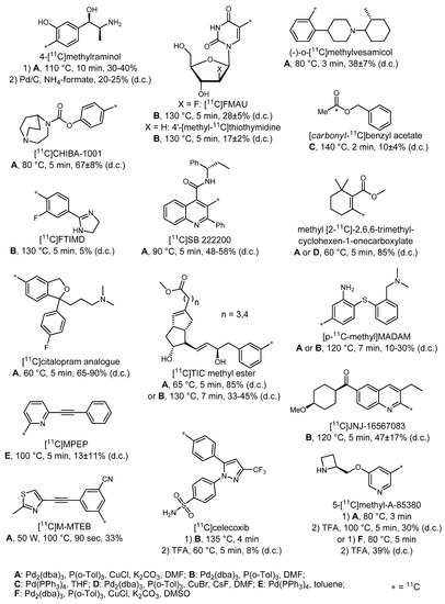 The present review summarizes recent developments in the field of labeling procedures using transition metal-mediated cross-coupling reactions for the introduction of the short-lived positron emitting radionuclides carbon-11 and fluorine-18 into organic molecules. Applications for radiolabeling using the Cu-mediated "click chemistry" have been reviewed in detail elsewhere [3,4] and will not be discussed here.