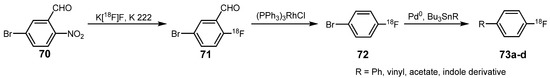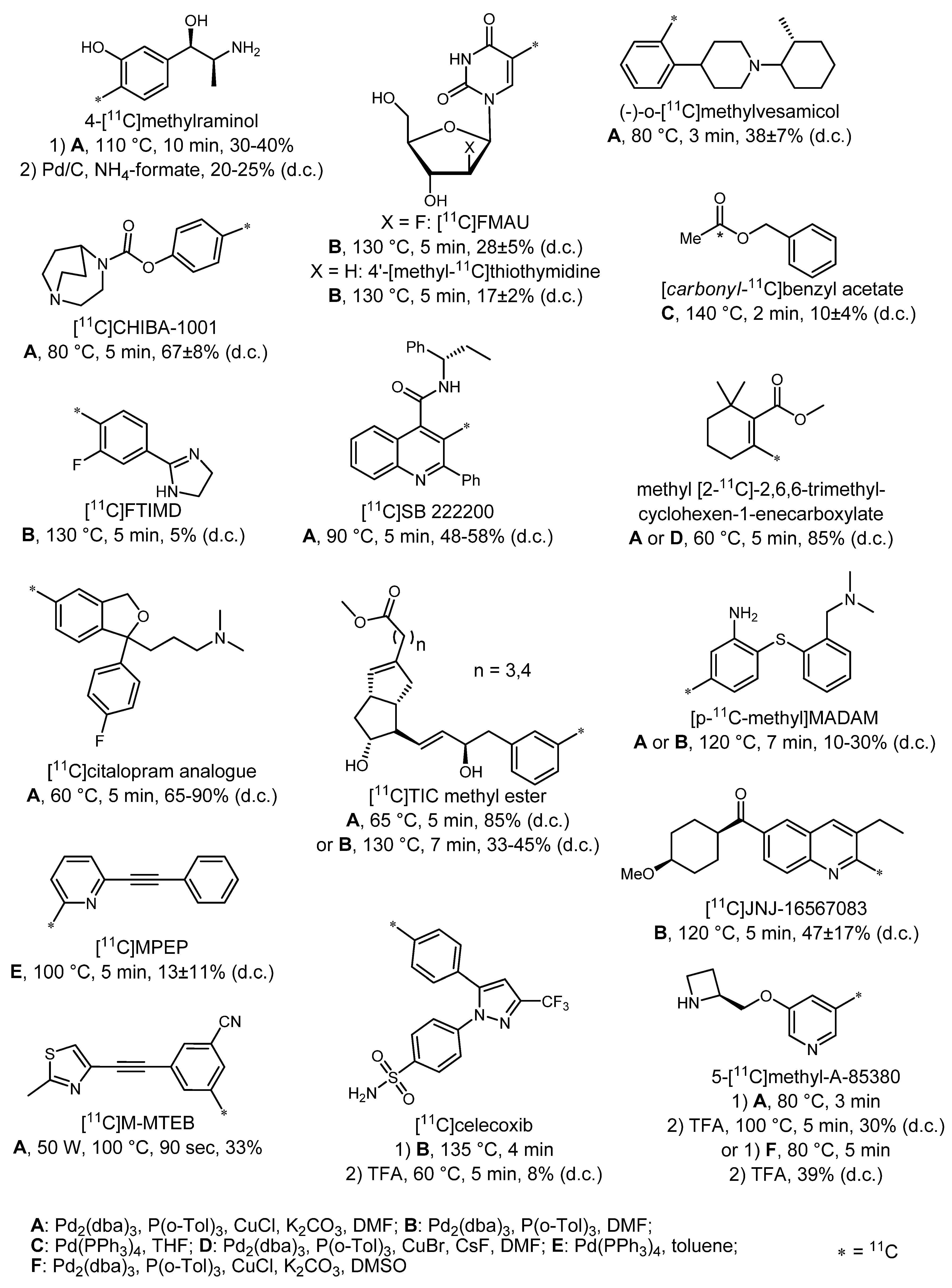 Selected target molecules have been radiolabeled with carbon-11 via standard Stille reaction before, thus enabling a comparison of these methods. The results of this study confirmed the group’s previous findings, as similar or higher RCYs and specific activities, respectively, were obtained by using the improved reaction conditions. Thus, the authors postulate that their method, whenever applicable, is superior due to easier purification of 11C-labeled products, less toxicity of the used organotin compounds along with similar RCYs. A wide range of 11C-labeled radiotracers has been developed using conditions similar to the typical Stille reaction.