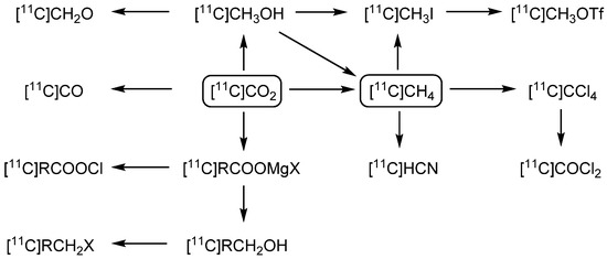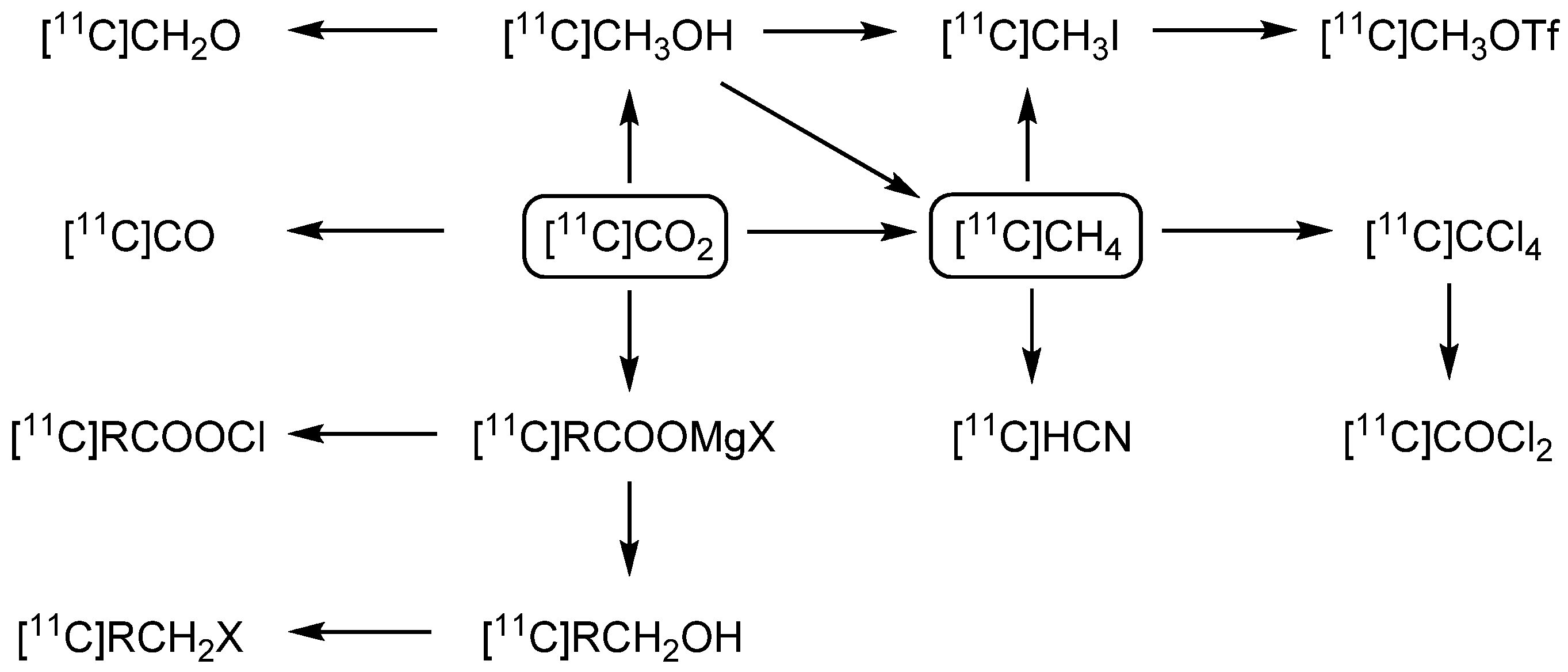 Carbon-11 is one of 13 known isotopes of the element carbon [5]. It is cyclotron-produced by a proton beam of about 10–17 MeV from a nitrogen-14 target which has previously been filled with a low concentration of oxygen or hydrogen. For this purpose, the 14N(p,α)11C nuclear reaction is exploited with a maximum theoretical specific activity of 3.4∙105 GBq·µmol−1 [6,7,8] which is never reached in practice. Carbon-11 is a suitable nuclide for PET imaging because of its high positron emission rate (99.8%) and its low energy positrons (1.0 MeV). Another advantage of carbon-11 is based on its chemical equivalence to carbon-12 and carbon-13, when incorporated into bioactive compounds for PET imaging purposes. Incorporation of carbon-11 results in equivalent, bioactive radiopharmaceuticals. In contrast, in particular fluorine-18 usually replaces hydrogen atoms or hydroxyl groups and might therefore be responsible for a different (bio-)chemical behavior of the resulting radiotracer [7,8]. Due to its short half-life of 20.4 min, radiosyntheses utilizing carbon-11 are generally performed within 60 min including purification of the crude radiolabeled product [9]. This fact led to the development of rapid 'on-line'-syntheses, by which the primary building block can be converted into the radiochemical compound, after the carbon-11 species has been transferred from the cyclotron directly to the hot cell. Carbon-11 usually arrives in the chemical form of [11C]CO2 or [11C]CH4 from the cyclotron, which represent the two most important 11C-labeled primary building blocks [10] from which nearly all other 11C-labeling units are produced (Scheme 1).