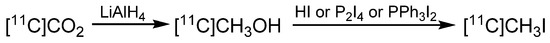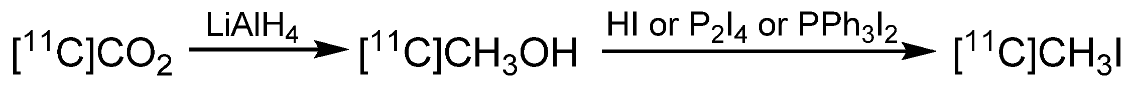 Two main methods for the production of [11C]methyl iodide as the most important and most widely used secondary [11C]building block are stated in the literature. One approach, referred to as "wet" chemistry method, deals with the reduction of [11C]CO2 to [11C]methanol utilizing LiAlH4 in THF or diethyl ether. The resulting [11C]methanol is then converted into [11C]methyl iodide by the use of hydroiodic acid, diphosphorus tetraiodide [9] or triphenylphosphane diiodide [10], respectively (Scheme 2). Afterwards, the resulting [11C]methyl iodide is dried and separated from by-products.