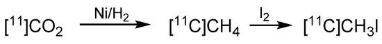 The second approach, also known as "gas phase" method, deals with the conversion of [11C]methane into [11C]methyl iodide by radical iodination with elemental iodine at 700–750 °C (Scheme 3). Depending on the primary radiolabeled building block produced by the cyclotron, it might be necessary to convert [11C]CO2 into [11C]CH4 beforehand by the use of a nickel catalyst [11], otherwise [11C]CH4 is used directly [12].