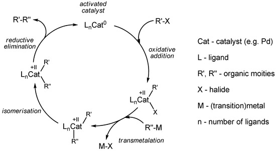 The most prominent and most commonly applied procedure for the radiolabeling with carbon-11 represents the nucleophilic [11C]methylation of alcohols, primary and secondary amines, thiols, carbanions or carboxylic acid derivatives with [11C]methyl iodide (or [11C]methyl triflate). Besides, transition metal-mediated cross-coupling reactions are gaining in importance for labeling reactions with carbon-11. Although the mechanism of cross-coupling is not fully understood, most intermediates have been identified, supporting the proposed classical mechanism depicted in Scheme 4. In most cases, the catalyst is a palladium-0 species. According to this theory, the reaction steps proceed as follows: An organic halide R'-X is coordinated to the Pd-catalyst by oxidative addition. A second (metal)organo compound R''-M reacts with the activated Pd species by transmetalation in the rate-determining step. After isomerization, the desired cross-coupled compound R'-R'' is formed via reductive elimination in the final step. The catalyst is released in the process, is thereby regenerated and available for the next catalysis cycle.