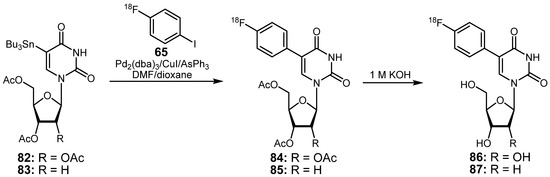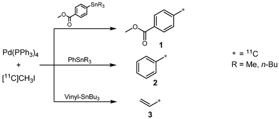 The first attempt for the introduction of carbon-11 in molecules by the Stille reaction was reported in a work of Andersson et al. in 1995. Several organotin sample molecules were used for the synthesis of 11C-labeled model arenes 1 and 2, as well as alkene 3 with radiochemical yields (RCYs) from 30 to 85% (Scheme 5) [17]. Optimizations to increase RCY and radiochemical purity were performed by exchanging solvents and stannane residues. Best results were found for aromatic trimethylstannyl compounds in DMF or DMSO. It was thereby demonstrated that the Stille reaction is a versatile tool for syntheses of 11C-labeled PET tracers as seen in Scheme 5.
