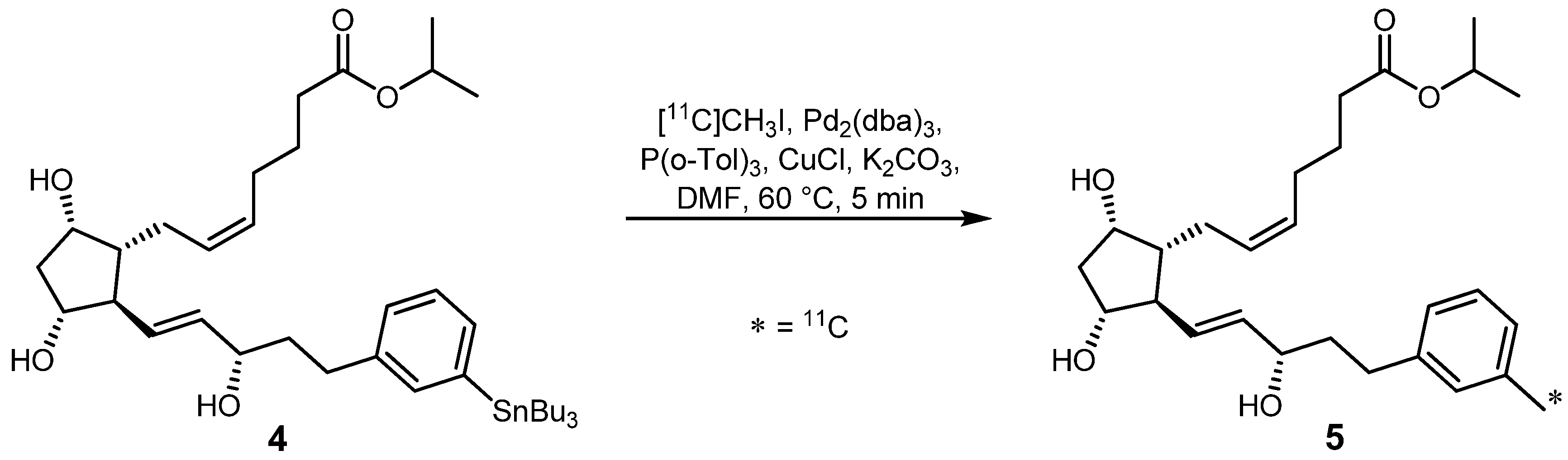The resulting radiotracer 5 is based on the known PGF2α drug Xatalan® and is applied for studies of prostaglandin (PG) receptors in the brain. Compound 5 was obtained in 34% RCY decay-corrected (d.c.) within 30 minutes after end of bombardment (EOB) with a specific activity of 100 GBq·µmol−1 and a radiochemical purity >95% [19].
