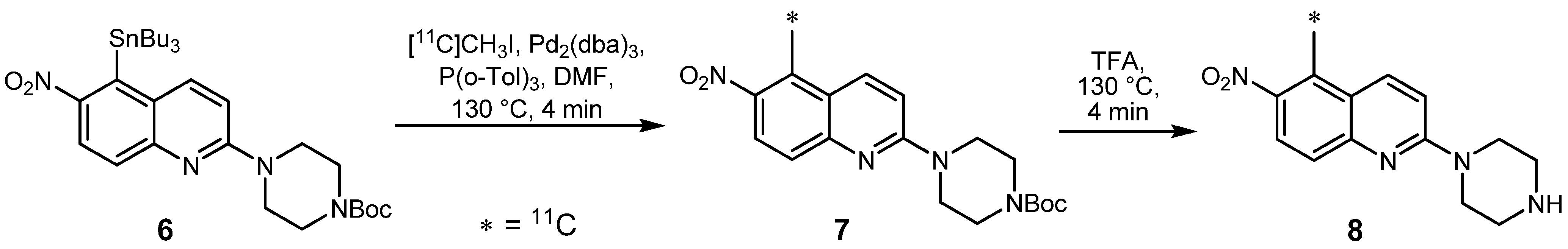 In 2002, Sandell et al. used similar conditions (Pd2(dba)3/P(o-Tol)3, DMF) for the preparation of [11C]5-methyl-6-nitroquipazine (8), an inhibitor for the serotonin (5-hydroxytryptamine) transporter (5-HTT) [20]. In contrast to the reaction conditions reported before [18,19], neither CuCl nor K2CO3 were added. In consequence of this omission, a higher reaction temperature (130 °C) and longer reaction time (~40 min after EOB) were required. However, compared to synthesis of 5, these reaction conditions delivered higher RCYs (60–80%) and radiochemical purities (>99%) of 8, but with a specific activity of only 19 GBq·µmol−1 after the two step synthesis depicted in Scheme 7. Upon radiosynthesis, compound 8 was tested as PET-tracer for the serotonin transporter 5-HTT in monkey brains. Unfortunately, it exhibited brain uptake kinetics which were too slow to justify further investigations.