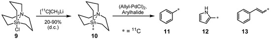 Due to the presence of other functional groups in the precursor like alcohols or amines, side reactions may occur [21]. Furthermore, preparation and purification of highly functionalized stannyl compounds can be difficult at times. In order to prevent such obstacles during the labeling process with [11C]methyl iodide and functionalized stannyl compounds, Forngren et al. presented the synthesis of the novel organotin compound 10. This molecule already contains the [11C]methyl group and is well suited for radiolabeling purposes under Stille conditions. In this case, various organohalides were labeled using the novel 11C-containing stannane 10 [22]. First, [11C]methyl iodide was converted into [11C]methyl lithium [23] and subsequently mixed with 5-chloro-1-aza-5-stanna-bicyclo-[3.3.3]-undecane (9) in order to form 5-[11C]methyl-1-aza-5-stannabicyclo[3.3.3]undecane (10) with RCYs ranging from 20 to 90% (d.c.) related to [11C]methyl iodide (Scheme 8). As stated by the authors, the wide range in yields observed when preparing 10 might to some extent be explained by the presence of proton sources in the reaction mixture, which results in the formation of [11C]methane as a side-product.