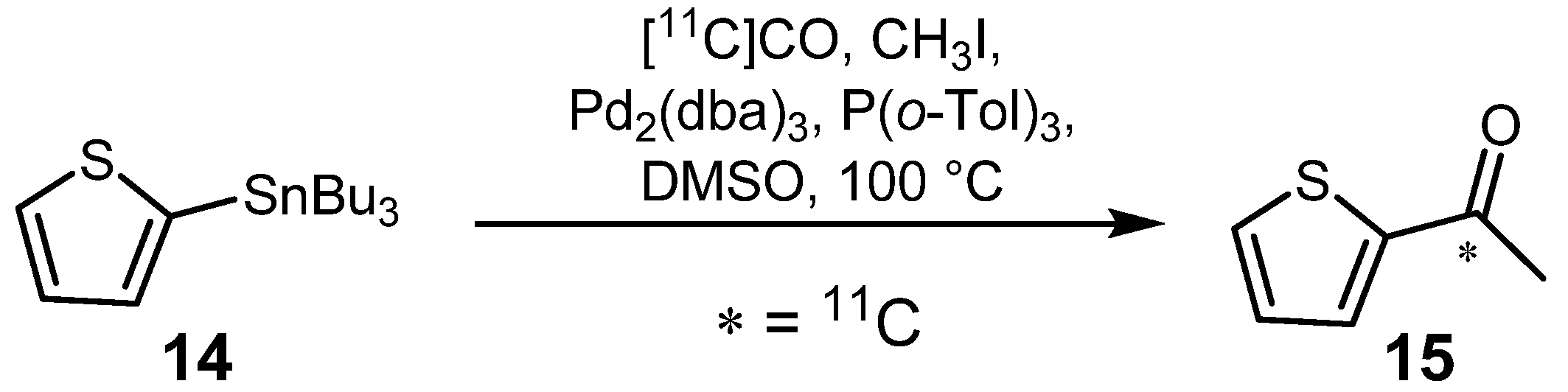 Automation of radiosyntheses is always desirable, which is also the case for the Stille reaction. In 2005, Karimi et al. demonstrated a straightforward procedure at which [11C]CO was used in the palladium-mediated carbonylative coupling of organic iodides with organostannanes to synthesize various unsymmetrical alkyl and aryl-[11C-carbonyl]ketones [24]. According to the authors, this method could be automated easily, although no further application has been reported to date. The syntheses carried out were fast and led to 20 different 11C-labeled molecules with RCYs ranging from 37 to 98% and specific activities of up to 300 GBq·µmol−1. Different reaction conditions were applied in order to scrutinize scope and limitations of the respective Pd-catalyst, the co-ligands, the temperature and the solvent. Highest RCYs were obtained in DMSO at 100 °C with an excess of P(o-Tol)3 relative to Pd-catalyst, which is depicted exemplarily for radiosynthesis of compound 15 (Scheme 9).