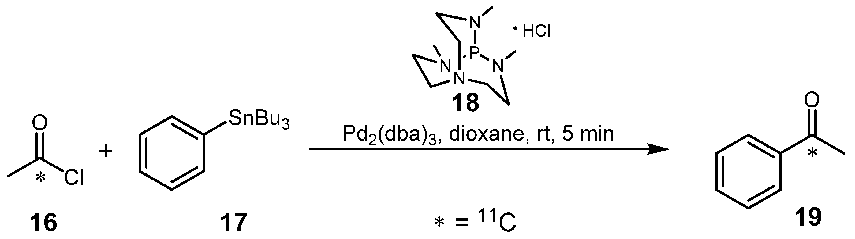 - Arai, T.; Kato, K.; Zhang, M.R. Synthesis of [carbonyl-11C]acetophenone via the Stille cross-coupling reaction of [1-11C]acetyl chloride with tributylphenylstannane mediated by Pd2(dba)3/P(MeNCH2CH2)3N·HCl. Tetrahedron Lett. 2009, 50, 4788–4791. [Google Scholar] [CrossRef]
