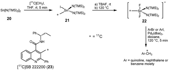 In 2006, Huiban et al. reported further improvements of the Stille reaction for radiochemical purposes. An application of less toxic mono-alkylstannanes instead of previously used di-, tri-, or tetra-alkylstannanes delivered higher radiochemical yields and allowed a facile removal of inorganic byproducts [27]. In a first step, [11C]methyl iodide was reacted with Lappert’s stannylene Sn[N(TMS)2]2 (20) [28] quantitatively (Scheme 11). Obtained mono[11C]methyl tin compound 21 was activated thereafter by addition of tetra-n-butylammonium fluoride at ambient temperature leading to stannate 22. The subsequent Pd-mediated Stille reaction of 22 with aryl bromides and iodides led to a wide variety of desired labeled heteroarenes with high RCYs (63 to 78%). Since no co-ligand like PPh3 was used, a formation of by-products (biaryl compounds), often formed by an aryl exchange reaction of such co-ligands with aryl substrates, was prevented. Based on this method, a new radiotracer [11C]SB 222200 (23) for the non-invasive study of functions and diseases involving cerebral neurokinin and opiate receptors, such as anxiety, depression, psychosis, schizophrenia and Parkinson’s disease [29], was prepared by the same working group [30]. However, no biological application has been reported to date.