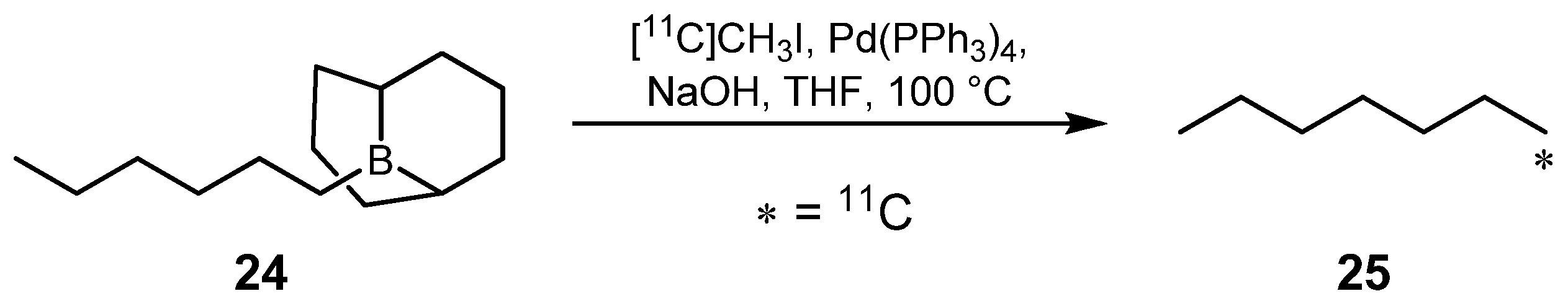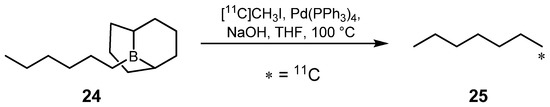 A method for the rapid incorporation of carbon-11 was presented by Andersson and co-workers in 1995 using the Suzuki cross-coupling [17]. For this purpose, 9-hexyl-9-BBN (24) was converted into 1-[11C]heptane (25) in a sample reaction with a RCY of 35% and a radiochemical purity >95% (Scheme 12). The labeling reaction was carried out using [11C]methyl iodide and Pd(PPh3)4 as catalyst with THF as solvent under basic conditions.
