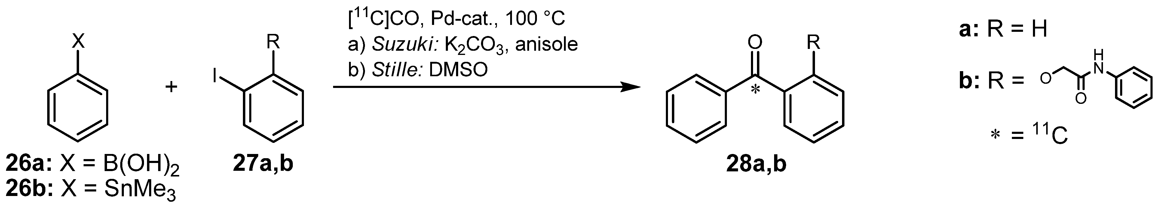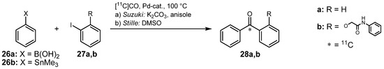 Another example of the use of the Suzuki reaction in comparison to the Stille reaction for labeling purposes with carbon-11 was presented in 2002 [55]. The structurally more complex, unsymmetrical benzophenone [carbonyl-11C]2-(2-benzoylphenoxy)-N-phenylacetamide (28b) was developed which functions as inhibitor of the reverse transcriptase of the human immunodeficiency virus type 1 (HIV 1), (Scheme 13). For this purpose, trapped [11C]CO gas was released into a vessel containing phenylboronic acid (26a), Pd(PPh3)2Cl2, K2CO3 in anisole and 2-iodophenylacetamide (27b). K2CO3 is used for the elimination of the dihydroxyboron residue in the transmetalation step. Unfavorably, K2CO3, which is insoluble in anisole, led to the adsorption of the carbon-11-labeled product 28b on the solid surface of K2CO3 and hence to a RCY of 20% only. Therefore, Stille reaction conditions were scrutinized by the authors as well, and yields and scope were compared to Suzuki conditions [55]. For this purpose, trimethyl(phenyl)stannane (26b) and 27b were reacted with Pd(PPh3)4 in DMSO under Stille conditions. As stated above, inhibitor 28b was obtained in 20% RCY in case of Suzuki conditions, whereas 71% RCY was achieved when Stille reaction conditions were applied. Obtained radiochemical purities >99% and specific activities >30 GBq·µmol−1 were similar with both synthesis routes. In this case, the Stille reaction is superior to the Suzuki reaction.