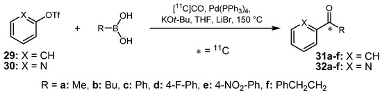 In 2004, Rahman and co-workers applied [11C]CO for a labeling technique allowing the synthesis of [11C-carbonyl]compounds in high radiochemical yields and with good specific activities in relatively short synthesis times [56]. Due to the low reactivity and solubility of [11C]CO in organic solvents, labeling reactions were carried out in a fully automated system [57]. Thus, the cyclotron-produced [11C]carbon monoxide was concentrated to a small volume, trapped on liquid nitrogen-cooled silica and transferred into a micro-autoclave that could be pressurized to 40 MPa. Different functionalized aromatic boronic acid derivatives and boronic esters were tested and a variation of applied additives and bases led to an increased RCY for 11C-labeled compounds (Scheme 14). Regarding the starting materials, it was pointed out in a previous publication that the use of aryl triflates represents a good alternative to aryl iodides and delivers higher RCYs of the respective labeled products [58]. A further improvement was achieved by the addition of bases such as tetra-butylammonium fluoride or potassium tert-butoxide which increases the RCY in most cases. These bases are believed to facilitate the formation of a boronate, which in turn supports the transmetalation step with palladium. Furthermore, lithium bromide was added to prevent catalyst decomposition or to promote the cross-coupling carbonylation reaction. The best results were obtained in a sample synthesis, in which pyridin-2-yl triflate (30) was reacted with phenylboronic acid (26a) and potassium tert-butoxide as base, leading to the formation of [carbonyl-11C]ketone 32c. The RCY was higher with KOt-Bu (78%) than without the use of a base (59%). It was discovered that in general, the RCY highly depends on the use of the respective boronic acid and the base: tetra-butylammonium fluoride delivered higher RCYs when used for cross-coupling purposes with alkyl boronic acids, whereas potassium tert-butoxide was more suitable when aromatic boronic acids were applied.