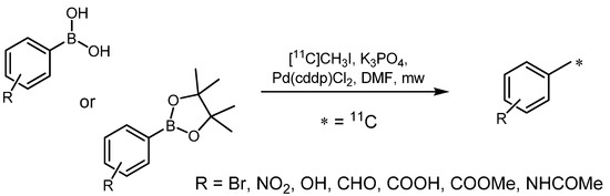 A further improvement of the Suzuki reaction for the preparation of carbon-11-labeled toluene derivatives was reported by Hostetler et al. in 2005. They found that the addition sequence of starting materials is crucial for the preparation of radiolabeled compounds in high RCYs [59]. The oxidative addition to the palladium complex has to be executed first when using trace amounts of alkyl halides, as it is the case in radiosyntheses. Therefore, first of all [11C]methyl iodide was distilled directly into the reaction vessel containing Pd(dppf)Cl2 dissolved in DMF (Scheme 15). Secondly, organoboron compound and base were added. Although the palladium catalyst is hardly soluble in DMF, this combination resulted in the highest RCYs, whereas the addition of typically used Pd(PPh3)4 catalyst led to palladium black as by-product along with lower RCYs. Another improvement was achieved by varying the used base. Aqueous KOAc and aqueous Cs2CO3 resulted in no product formation, whereas aqueous NaOH led to increased RCYs. However, aqueous K3PO4 was the mildest base and yielded the desired product in high RCYs. In general, a short treatment with microwaves (90 s) still raised the RCYs. In addition, application of different organoboron species was scrutinized, however, all investigated boron species showed similar RCYs. Acidic proton possessing moieties like 4-hydroxyphenylboronic acid pinacol ester as well as 4-carboxybenzeneboronic acid pinacol ester could be used in combination with the base K3PO4 without any difficulty. In these reactions a maximum RCY of 92% (d.c.) was reached for the preparation of p-[11C]cresol with >95% radiochemical purity in less than 20 minutes according to the release of [11C]methyl iodide.