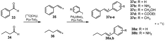 The Heck reaction does not follow the classical mechanism of a cross-coupling reaction, but also involves a palladium-catalyzed C-C-bond formation between olefins and aryl/vinyl halides [60]. Björkmann and Långström described a method in which 11C-labeled olefins 35 and 36 were prepared and subsequently cross-coupled using a Pd-mediated Heck reaction yielding (E)-[11C]stilbenes 37a-e and (E)-[1-11C]pent-1-enes 38a,b, respectively (Scheme 16) [61]. During this reaction sequence, [11C]methyl iodide was incorporated in a first step into benzaldehyde (33) and butyraldehyde (34) via Wittig olefination to form [11C]styrene (35) and [1-11C]pent-1-ene (36), respectively. Since traces of triphenylphosphane as co-ligand were able to perform an aryl exchange in the Pd-complex with the appropriate substituted aryl halide, [11C]stilbene was formed as by-product in all preparations. To circumvent this side reaction, the use of tri-o-tolylphosphane in the primary Wittig olefination as well as in the subsequent Heck reaction was essential to obtain the desired coupling products. Additionally, an excess of Pd species was necessary in the Heck reaction in order to transform the [11C]olefins 35 and 36 quantitatively. Of the model compounds depicted in Scheme 16, highest RCYs were obtained for 37b (40%) and 38b (54%) (d.c.) under optimized conditions (150 °C, 5 min). In both cases, the radiochemical purity achieved was greater than 95% after 40 min total synthesis time.