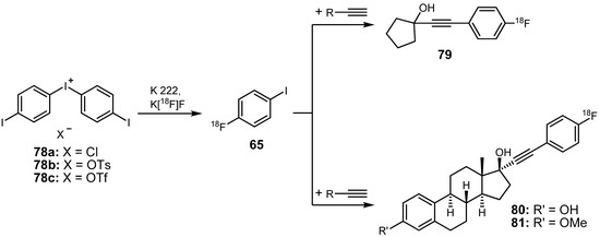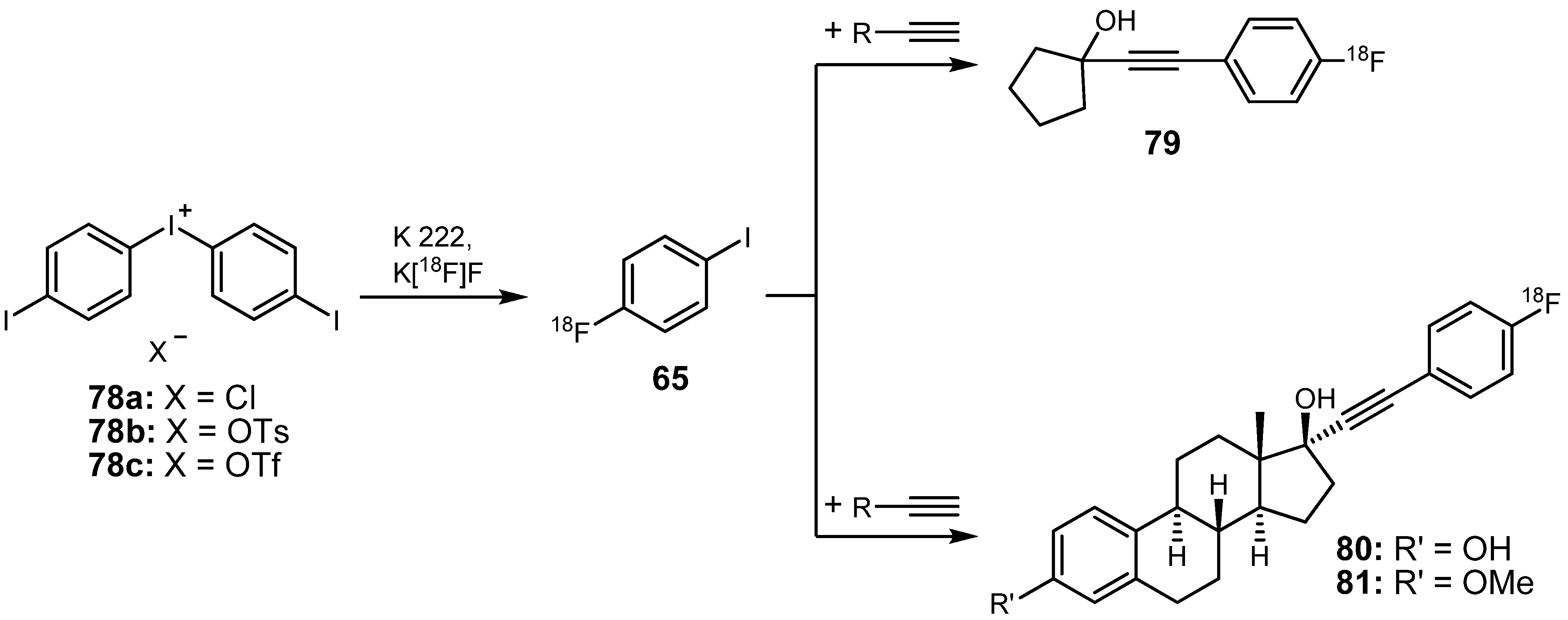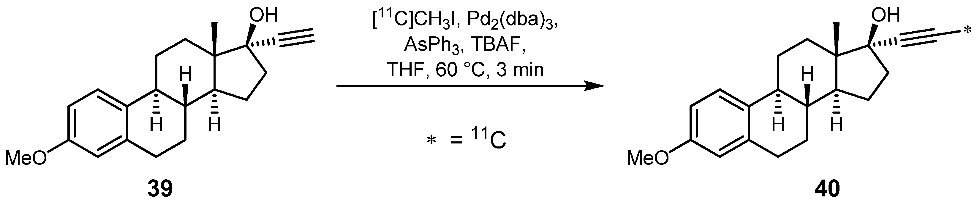 Regarding radiolabeling with carbon-11, the only work found in the literature dealing with the Sonogashira reaction was published in 2003. Wuest et al. reported the radiolabeling of model steroid 17α-(3'-[11C]prop-1-yn-1-yl)-3-methoxy-3,17ß-estradiol (40) by means of [11C]methyl iodide (Scheme 17) [63]. Classical Sonogashira reaction conditions with copper(I) salts and bases such as triethylamine were tested but resulted in very low RCYs (1-6%) due to the consumption of [11C]methyl iodide by the used amine base. However, the reaction conditions were modified which finally led to preparation of 11C-labeled steroid 40 at RCYs in the range of 49 to 64% (d.c.). Terminal alkyne 39 was used as precursor as well as Pd2(dba)3, AsPh3 and tetra-n-butyl-ammonium fluoride. After a total synthesis time of 21-27 min, a radiochemical purity >99% was achieved, unfavorably along with quite low specific activities (10-19 GBq·µmol−1). Functional groups like the hydroxyl group were not affected and made this procedure a valuable tool for 11C-radiolabeling.