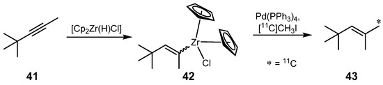 In 2006, Wuest and Berndt described a novel palladium-mediated cross-coupling strategy for 11C-C bond formations utilizing alkenylzirconocene complexes [64], which represent a valuable tool for the preparation of 11C-labeled compounds containing a prenyl group. The synthesis route of model compound 2,4,4-[11C]trimethyl-pent-2-ene (43) is depicted in Scheme 18. (4,4-Dimethylpent-2-en-2-yl)zirconocene complex (42) was applied as precursor in this reaction and was obtained by syn-addition of the Zr-H bond of Schwartz reagent [Cp2Zr(H)Cl] onto an internal C-C triple bond of 4,4-dimethylpent-2-yne (41) [65]. Treatment of 41 with an excess (2.5 equivalents) of Schwartz reagent was necessary in order to form the thermodynamically stable alkenylzirconocene 42 exclusively. The authors demonstrated that this complex undergoes transmetalation with metal complexes M(PPh3)4 (M = Pd, Pt, Ni), at which this reaction step with Pd is superior to other investigated transition metals such as Pt or Ni. A subsequent cross-coupling was initiated and, upon addition of [11C]alkyl halides and 5 mol% of Pd(PPh3)4, new 11C-C bonds were formed under retention of the double bond configuration yielding prenyl derivatives such as model compound 43. These reactions require an internal alkyne in order to present a good electrophile for the insertion step. In contrast, slightly reducible functions like esters or nitro groups do not yield the desired product due to the formation of alkenylzirconocenes followed by hydrozirconization. Various internal alkynes were applied, but the highest RCY of 75% based upon unreacted [11C]methyl iodide was obtained for compound 43.