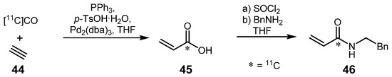 The acrylamide moiety is part of the structure of various bioactive compounds and could, after further chemical modifications, be used to design new PET tracers [66]. Previous methods for the synthesis of N-substituted [carbonyl-11C]acrylamides dealt with the use of [11C]carbon dioxide. In this case, [11C]CO2 is treated with the respective Grignard reagent to obtain the corresponding [1-11C]acrylic acid with a moderate specific radioactivity of 200–500 MBq·μmol−1 due to isotopic dilution originating from atmospheric carbon dioxide, which also reacted with the Grignard reagent [67]. To increase the specific radioactivity associated with an application of [11C]CO2, Eriksson et al. developed two novel procedures for the preparation of several [carbonyl-11C/13C]acrylamides [68]. The first method involved the palladium-catalyzed cross-coupling reaction between [11C/13C]CO and acetylene (44) to yield [1-11C]acrylic acid (45). This step was followed by chlorination with SOCl2 and subsequent treatment with benzylamine. The respective 11C-labeled acrylamide 46 was obtained in 51 ± 4% (d.c.) radiochemical yield based on [11C]carbon monoxide with a specific radioactivity of 330 ± 4 GBq·μmol−1 (Scheme 19). Co-labeling with [13C]carbon monoxide confirmed the labeling position via 13C-NMR spectroscopy.