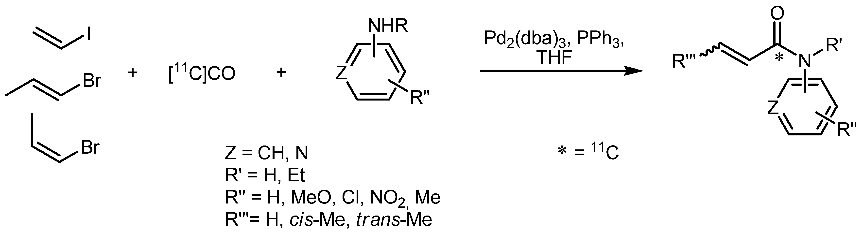 - Eriksson, J.; Åberg, O.; Långström, B. Synthesis of [11C]/[13C]Acrylamides by Palladium-Media-ted Carbonylation. Eur. J. Org. Chem. 2007, 455–461. [Google Scholar]