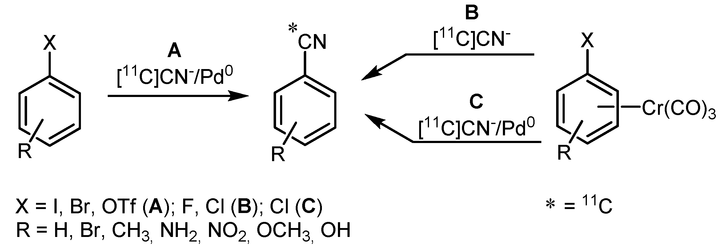 - Andersson, Y.; Långström, B. Transition Metal-mediated Reactions using [11C]Cyanide in Synthesis of 11C-labelled Aromatic Compounds. J. Chem. Soc. Perkin Trans. 1 1994, 1395–1400. [Google Scholar] [CrossRef]