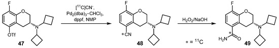 In 1999, Sandell et al. reported about the potential 5-HT1A receptor antagonist [11C]NAD-299 49, which was labeled with [11C]cyanide via a Pd-mediated cross-coupling [71]. It was mentioned that this PET tracer (Ki = 0.6 nM) should help finding serotonin transporter dysfunctions in the human brain. For that purpose, a straight forward method for the synthesis of compound 49 was developed. Reaction conditions evaluated by Andersson and Långström in 1995 [17] were applied and 1,1'-bis-(diphenyl-phosphino)ferrocene (dppf) was used as co-ligand and anhydrous N-methyl-2-pyrrolidinone (NMP) as assisting compound. Antagonist 49 was obtained in 20-40% RCY with a specific activity of 24 GBq·µmol−1 and a radiochemical purity >99% in a total synthesis time of 40-45 min. (Scheme 22) Biodistribution studies confirmed that [11C]NAD-299 (49) is a potential radiotracer for the 5-HT1A receptor due to its high affinity and selectivity in vivo.