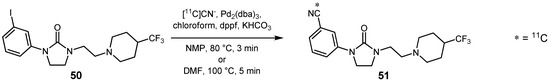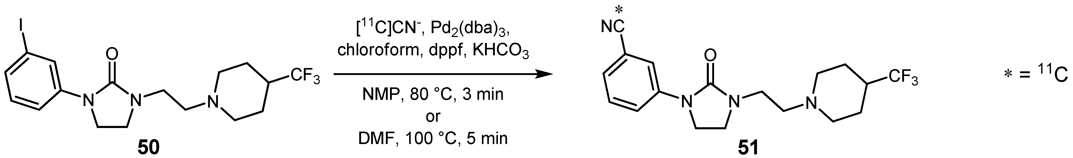 Antagonist 51 was prepared via a palladium(0)-catalyzed cross-coupling between precursor 50 and [11C]cyanide using Pd2(dba)3, CHCl3/dppf and KHCO3 as base in either NMP (80 °C, 3 min) or DMF (100 °C, 5 min). Afterwards, the crude product was purified by reverse-phase HPLC to yield 899 ± 326 MBq of 51 with a specific activity at end of synthesis (EOS) of 55.5 ± 25.9 GBq·μmol−1 and both chemical and radiochemical purities >99%. However, due to the fact that 51 has a too low pKi and due to the low density of D3 receptors in brain, no specific signal was found using this radiotracer in animal PET studies.