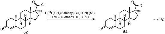 In 1997, Lidström and co-workers used the novel developed lithium [11C]methyl(2-thienyl)cuprate (53) in order to produce [21-11C]-labeled progesterone 54 for its application in in vitro and in vivo PET studies [73]. The required cuprate 53 was synthesized via an exchange reaction of n-BuLi with [11C]methyl iodide, followed by the addition of lithium(2-thienyl)cyanocuprate. Deoxycorticosterone in the form of acid chloride 52 was reacted with [11C]cuprate 53 to yield [21-11C]progesterone 54 using cross-coupling conditions as depicted in Scheme 24. Synthesized carbon-11 labeled hormone 54 was obtained with a specific activity of 14 GBq·µmol−1 and a decay-corrected radiochemical yield of 30-35% within 35 min.