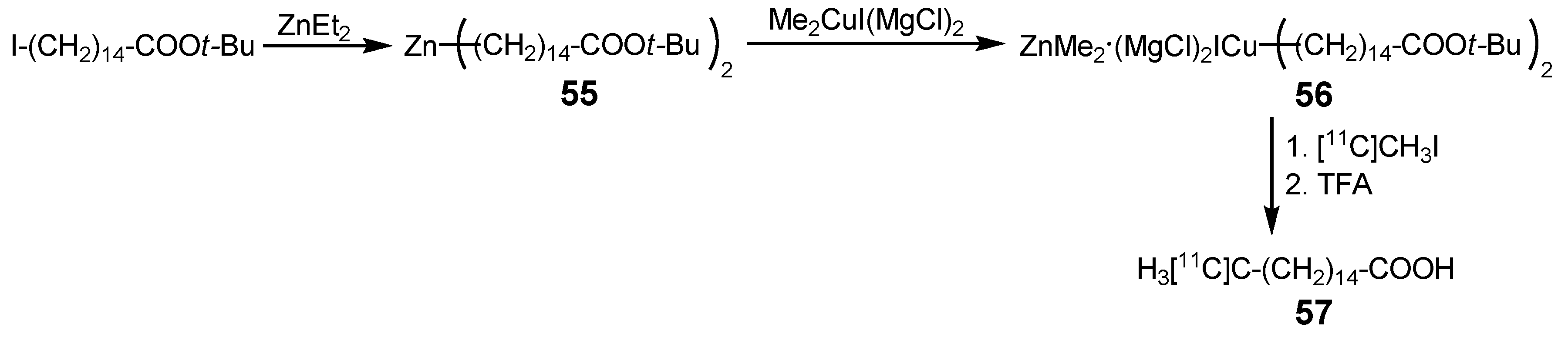 - Wuest, F.; Dence, C.S.; McCarthy, T.J.; Welch, M.J. A New Approach for the Synthesis of [11C]-Labeled Fatty Acids. J. Labelled Compd. Radiopharm. 2000, 43, 1289–1300. [Google Scholar] [CrossRef]