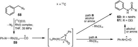 - Doi, H.; Barletta, J.; Suzuki, M.; Noyori, R.; Watanabe, Y.; Långström, B. Synthesis of 11C-labelled N,N'-diphenylurea and ethyl phenylcarbamate by a rhodium-promoted carbonylation via [11C]isocyanatobenzene using phenyl azide and [11C]carbon monoxide. Org. Biomol. Chem. 2004, 2, 3063–3066. [Google Scholar] [CrossRef]