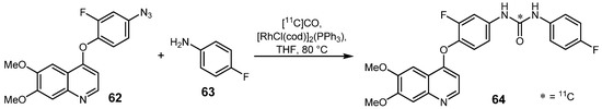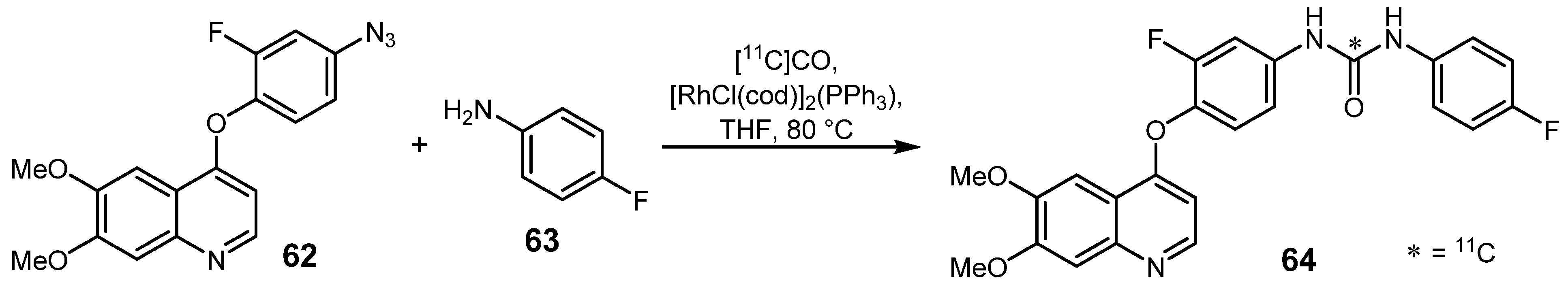 - Ilovich, O.; Åberg, O.; Långström, B.; Mishania, E. Rhodium-mediated [11C]Carbonylation: a li-brary of N-phenyl-N'-{4-(4-quinolyloxy)-phenyl}-[11C]-urea derivatives as potential PET angio-genic probes. J. Labelled Compd. Radiopharm. 2008, 52, 151–157. [Google Scholar]