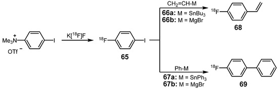 - Allain-Barbier, L.; Lasne, M.C.; Perrio-Huard, C.; Moreau, B.; Barré, L. Synthesis of [18F]Fluorophenyl Alkenes or Arenes via Palladium-Catalyzed Coupling of 4-[18F]Fluoroiodo-benzene with Vinyl and Aryl Tin Reagents. Acta Chem. Scand. 1998, 52, 480–489. [Google Scholar] [CrossRef]