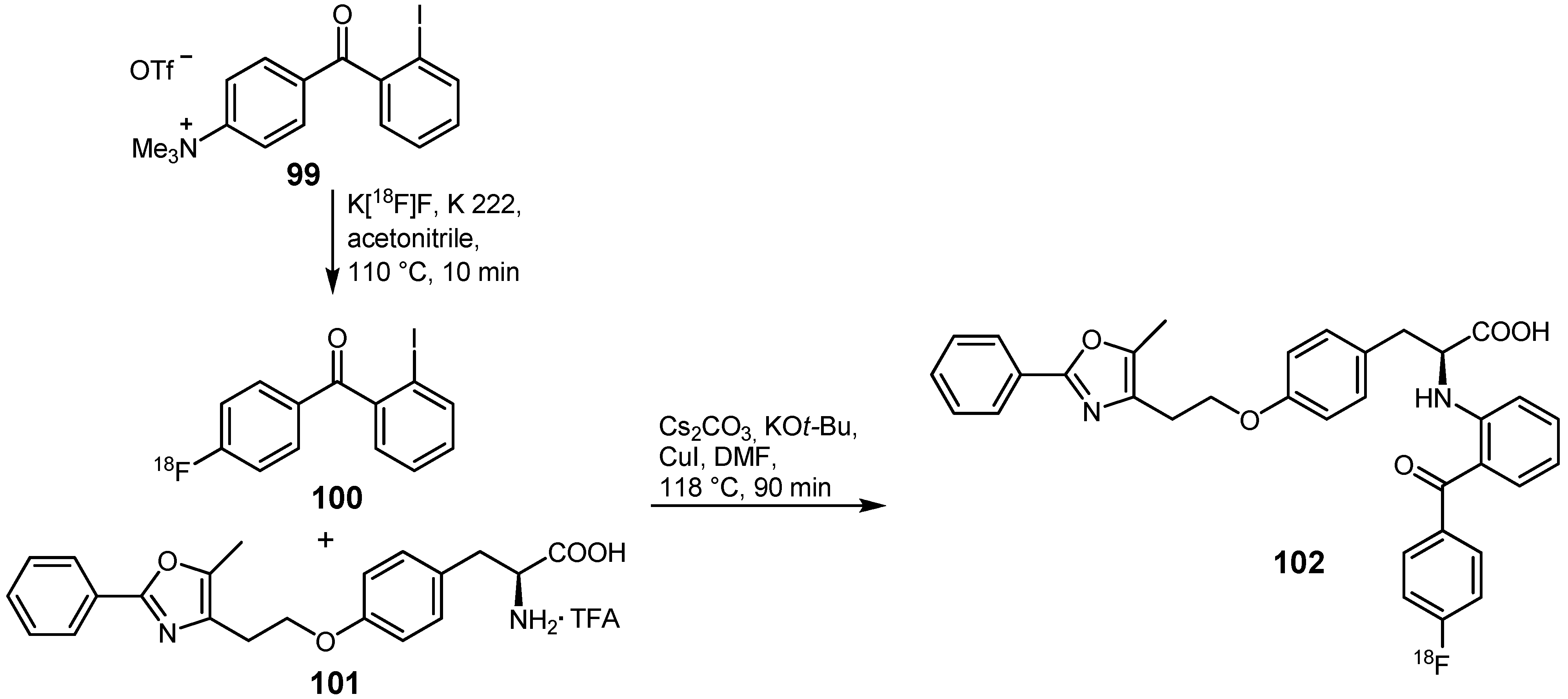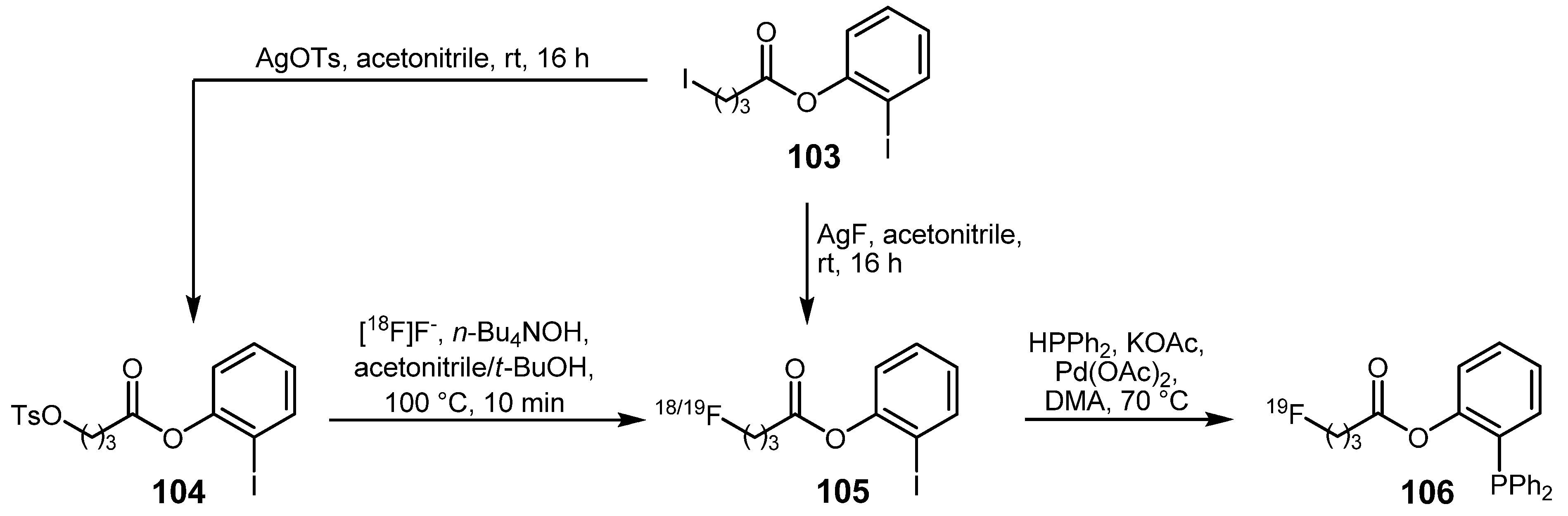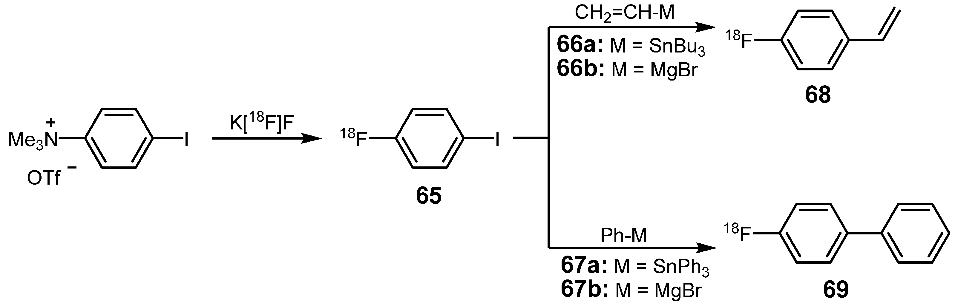 Transition metal-catalyzed cross-coupling reactions have been used extensively in carbon-carbon as well as carbon-heteroatom bond-forming reactions [1]. The central importance of these reactions using cross-coupling methods in organic chemistry as well as life sciences was honored with the Nobel Price in Chemistry in the year 2010 [2]. In the majority of cases, this kind of reactions is adopted for the preparation of the precursor scaffold which is subsequently labeled directly or indirectly with radiolabeled building blocks. Accessorily, cross-coupling reactions can be applied for indirect labeling due to the mostly mild reaction conditions and the short reaction times which are of major importance in radiochemistry. Therefore, it is possible to use these reactions in rapid and facile labeling syntheses involving the introduction of short-lived nuclides carbon-11 and fluorine-18. Advantageous, these coupling reactions allow highly selective and functional group-tolerating syntheses of radiotracers bearing both radionuclides.