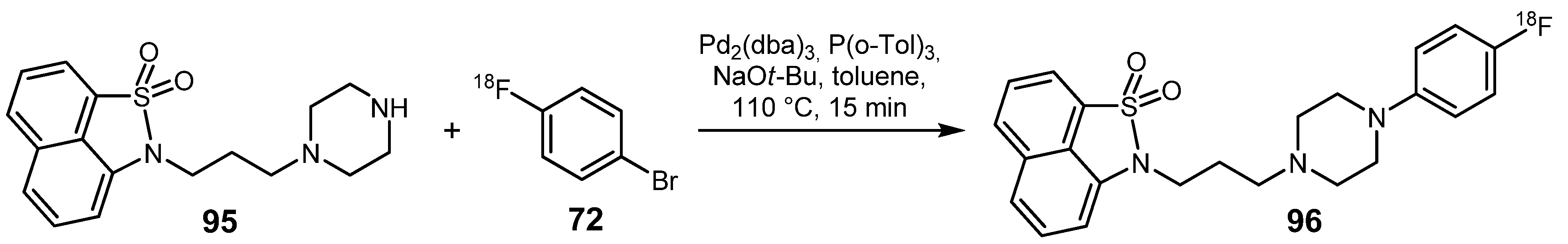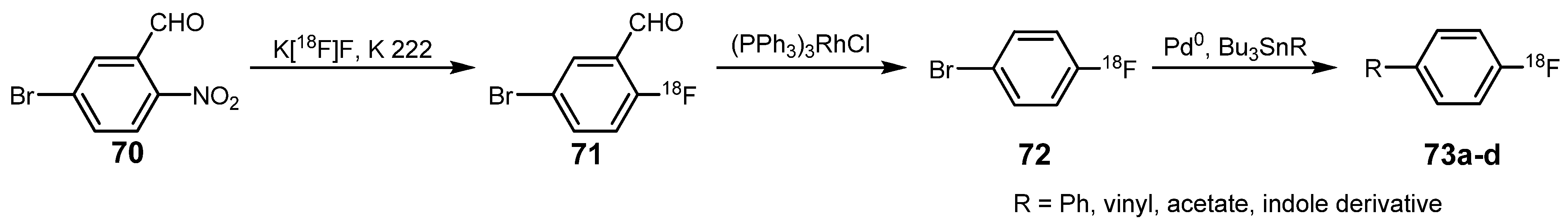 - Plenevaux, A.; Lemaire, C.; Palmer, A.J.; Damhaut, P.; Comar, D. Synthesis of non-activated 18F-fluorinated aromatic compounds through nucleophilic substitution and decarboxylation reactions. Int. J. Radiat. Appl. Instrument. Part A; Appl. Radiat. Isot. 1992, 43, 1035–1040. [Google Scholar] [CrossRef]