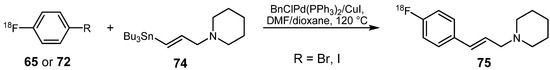 An attempt for a general radiolabeling strategy with carbon-11 using the Stille reaction was published years later [18]. Therefore, high numbers of aromatic model stannanes were labeled with [11C]methyl iodide under different conditions. Best results were obtained when Pd2(dba)3 was used with P(o-Tol)3 as co-ligand and CuCl/K2CO3 as additive in DMF.