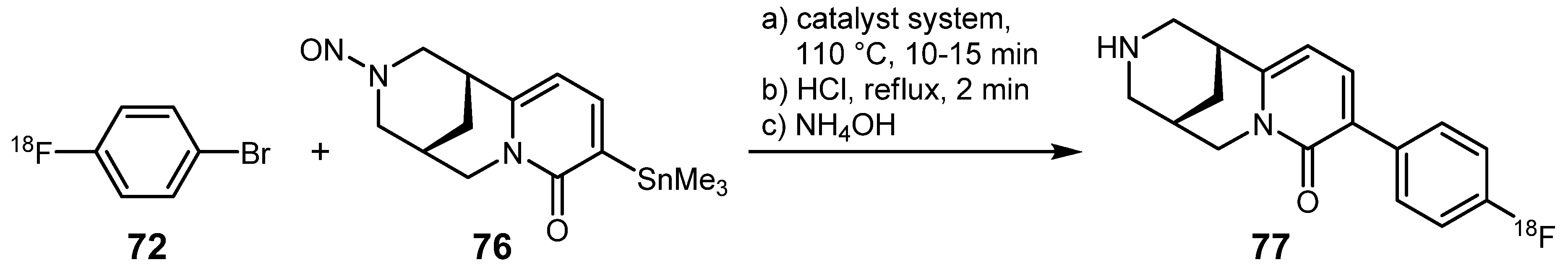 - Forngren, T.; Andersson, Y.; Lamm, B.; Långström, B. Palladium-Mediated Coupling Reactions of 18F-Labelled Arylhalides with Organotin Compounds. J. Labelled Compd. Radiopharm. 1995, 37, 595–596. [Google Scholar]