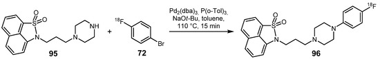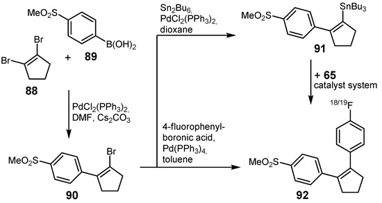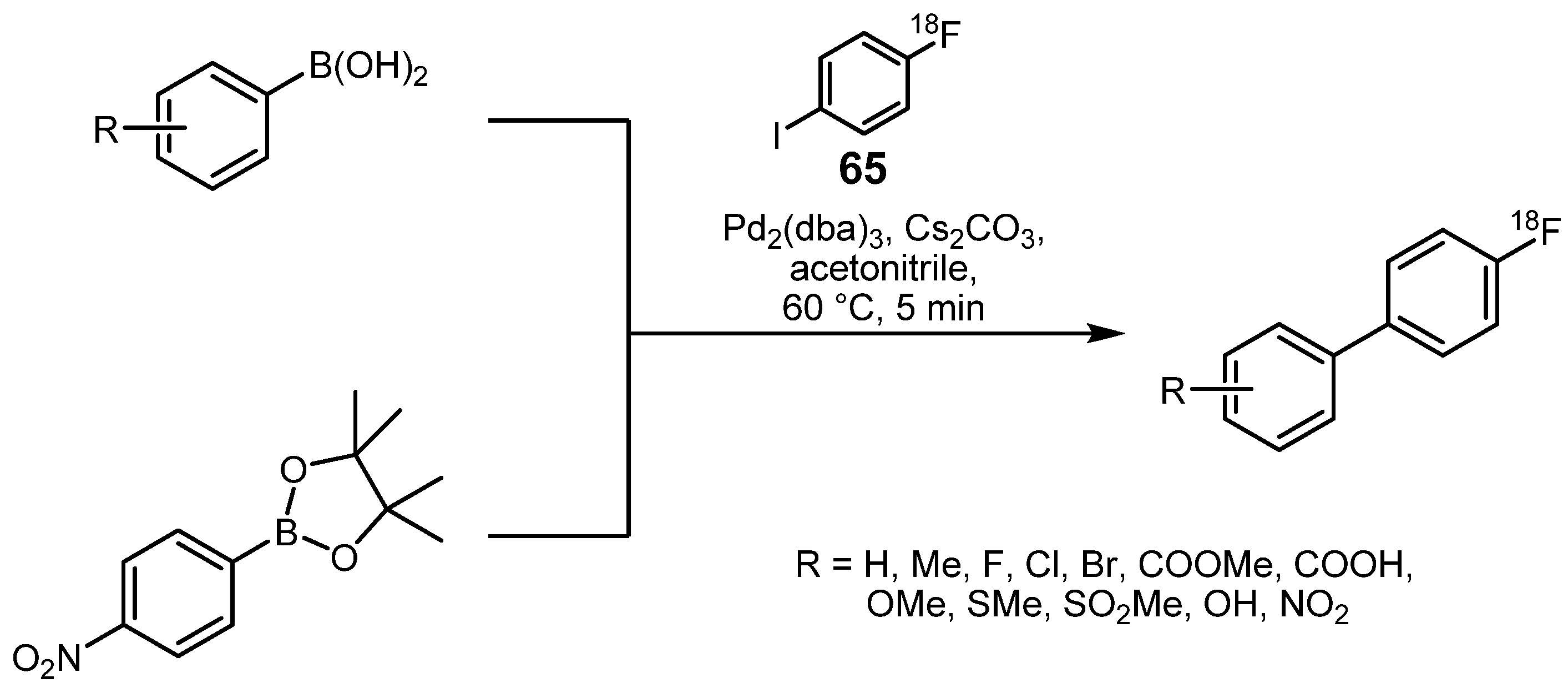 After the Suzuki reaction was proven to be a versatile and mild cross-coupling method for the introduction of [11C]CO or [11C]methyl iodide with good RCYs, an application for the preparation of 11C-labeled PET-tracers using cross-coupling seems to be a reasonable approach. However, no further applications for this synthesis strategy were found in the literature to date.