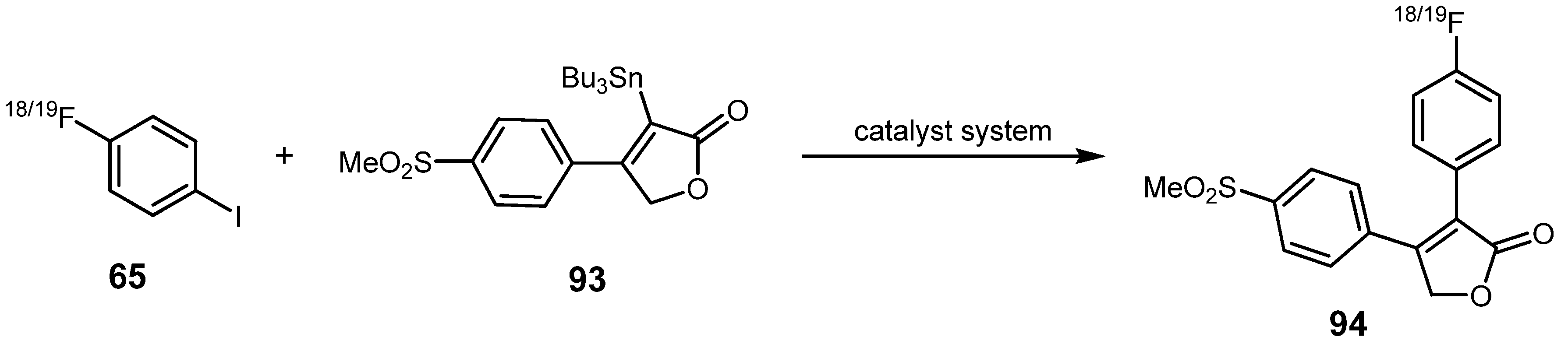 - Wüst, F.R.; Höhne, A.; Metz, P. Synthesis of 18F-labelled cyclooxygenase-2 (COX-2) inhibitors via Stille reaction with 4-[18F]fluoroiodobenzene as radiotracers for positron emission tomography (PET). Org. Biomol. Chem. 2005, 3, 503–507. [Google Scholar] [CrossRef]