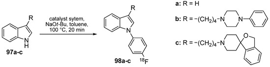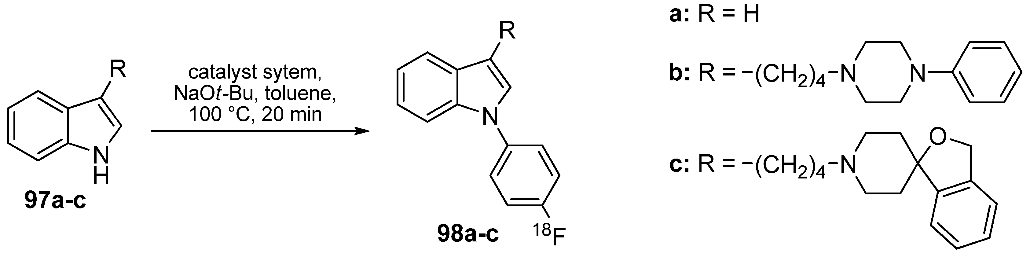 - Wüst, F.R.; Kniess, T. N-Arylation of indoles with 4-[18F]fluoroiodobenzene: synthesis of 18F-labelled σ2 receptor ligands for positron emission tomography (PET). J. Labelled Compd. Radiopharm. 2005, 48, 31–43. [Google Scholar] [CrossRef]