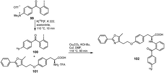 - Nader, M.W.; Oberdorfer, F. Syntheses of [carbonyl-11C]2-(2-benzoylphenoxy)-N-phenylacet-amide from [11C]carbon monoxide by the Suzuki and the Stille reactions. Appl. Radiat. Isot. 2002, 57, 681–685. [Google Scholar] [CrossRef]