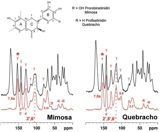 Figure 1. Solid state 13C CP-MAS spectra of leather (the black solid traces) tanned with tannins from mimosa (left) and quebracho (right). These are plotted above identically acquired spectra from the respective pure tannins (the red dotted traces). Also shown is a generic structure of the repeating flavonoid units predominating in each tannin; usually it is the A-ring 8, and 6, carbons (dashed bonds) which attach to the C-ring 4-carbon atom of a neighbour flavonol. In the spectra of the leather, tannin signals which are well resolved from collagen signals, and therefore reliable “fingerprints” of the tannin type used in the tanning process, are marked “T”. The vertical dashed lines highlight the envelope of signals the intensity of which is diagnostic of mimosa tanning (B-ring 2’ and 6’ carbon atoms at 105 ppm) and quebracho tanning (B-ring 2’, 5’ and 6’ carbon atoms at 115 ppm). Asterisks highlight signals from the A-ring 7 and 8a carbons indicative of condensed polyflavonoid tannins and their presence in leather. Some other assignments are shown; the suffixes “t” and “i” respectively indicate signals from carbon atoms at the terminus of, or internal to, the polyflavonol structure.