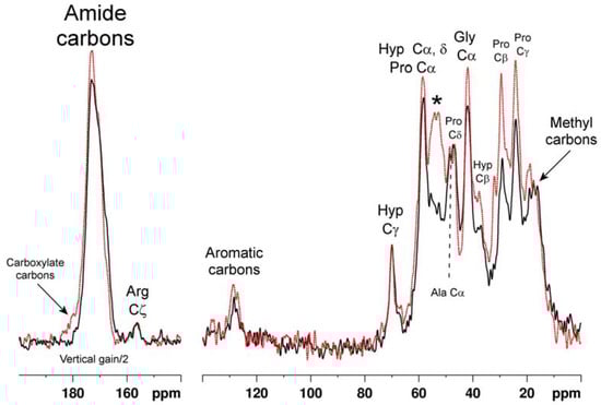 Figure 3. Solid state 13C CP-MAS spectrum of leather tanned with chromium (III) (the black solid trace) superimposed on a spectrum of untanned hide (red dotted trace). Some assignments to carbon atoms in specific collagen amino acid residues or residue types are also indicated. The asterisk marks the envelope of overlapped signals from inter alia the α-carbons of several types of residues, including aspartate and glutamate. Ala – alanine, Gly – glycine, Hyp – hydroxyproline, Pro – proline.